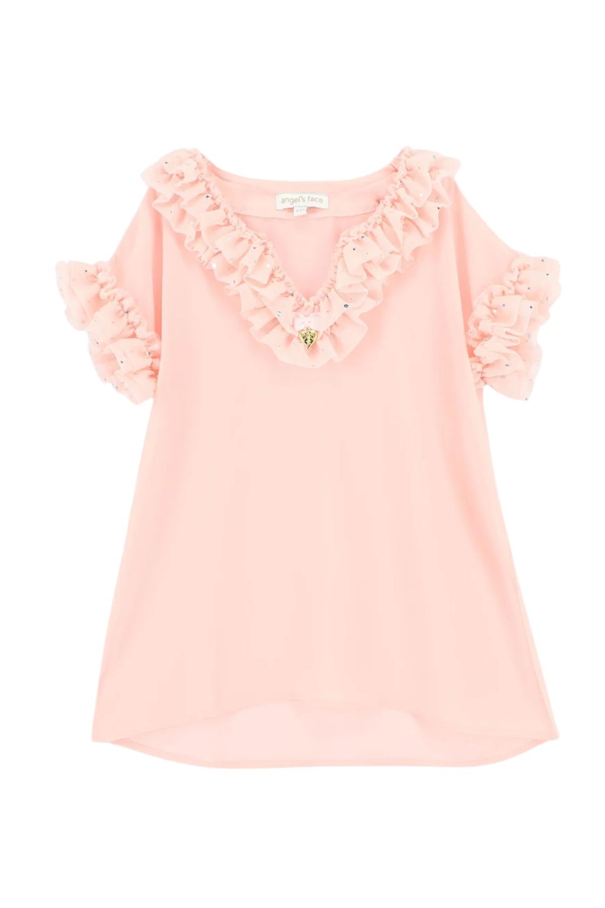 Short sleeved cover up with soft tulle ruffles decorated with a sparkly finish