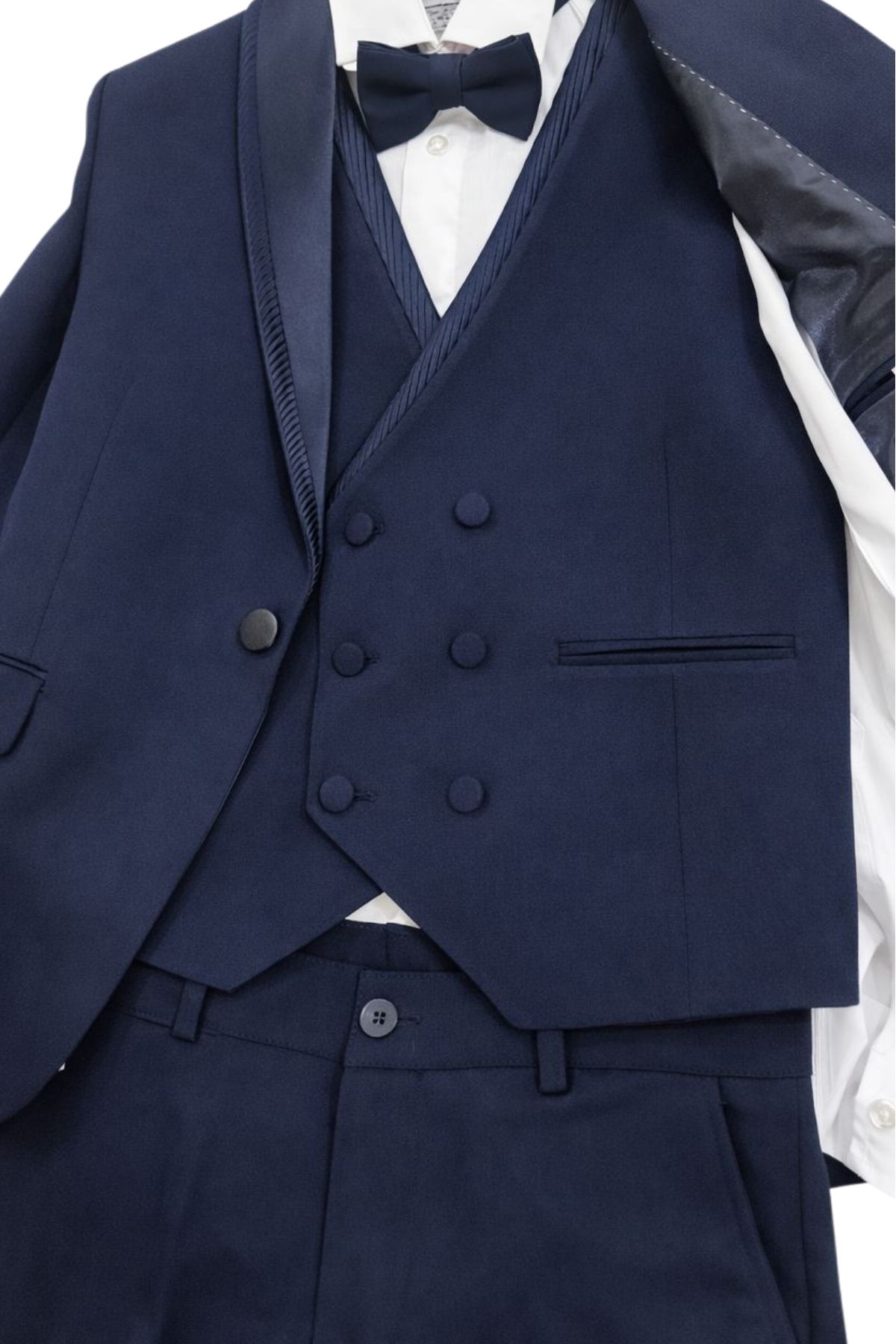 With navy blue bow tie