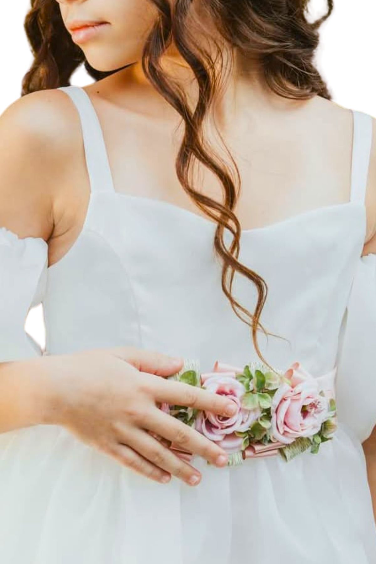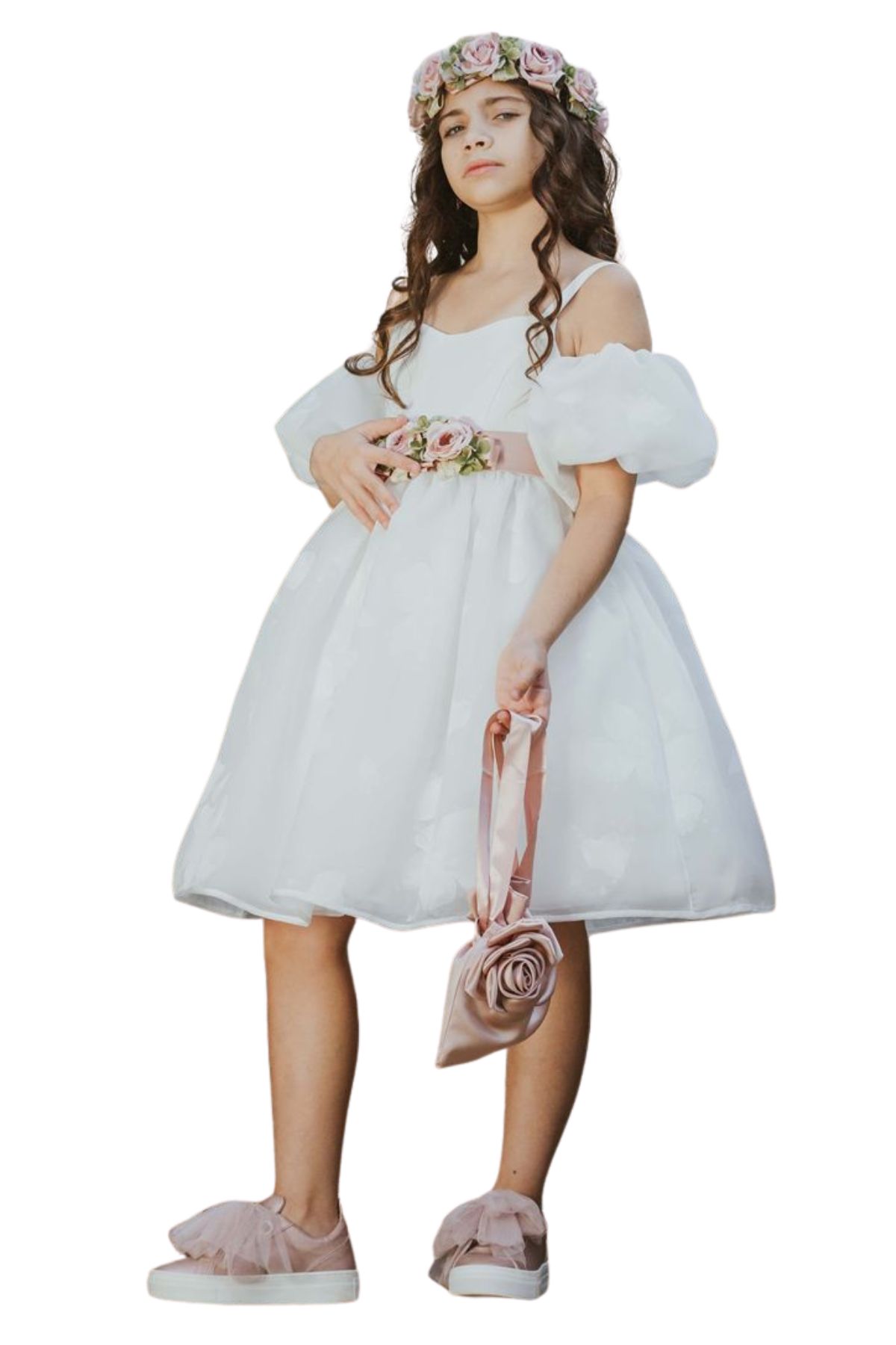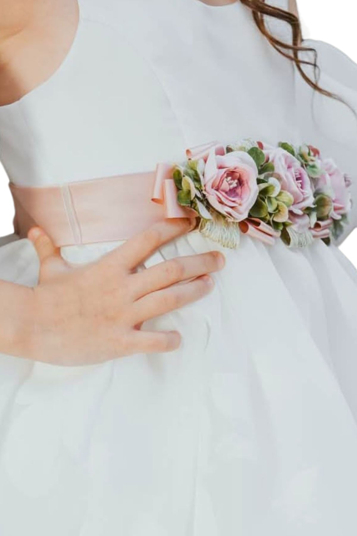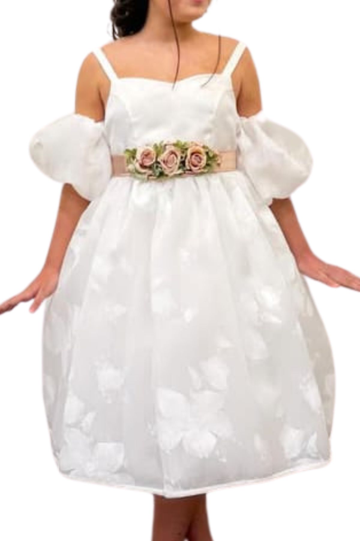 White First Communion dress with pink and green flowers