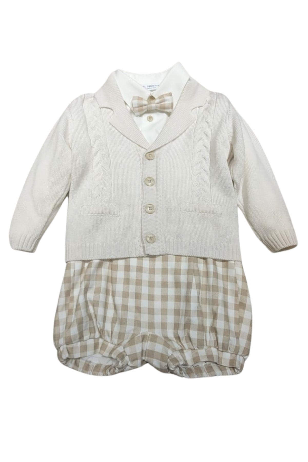 Beige and white checked romper overalls, with braces to be fastened with buttons, elastic waist on the back