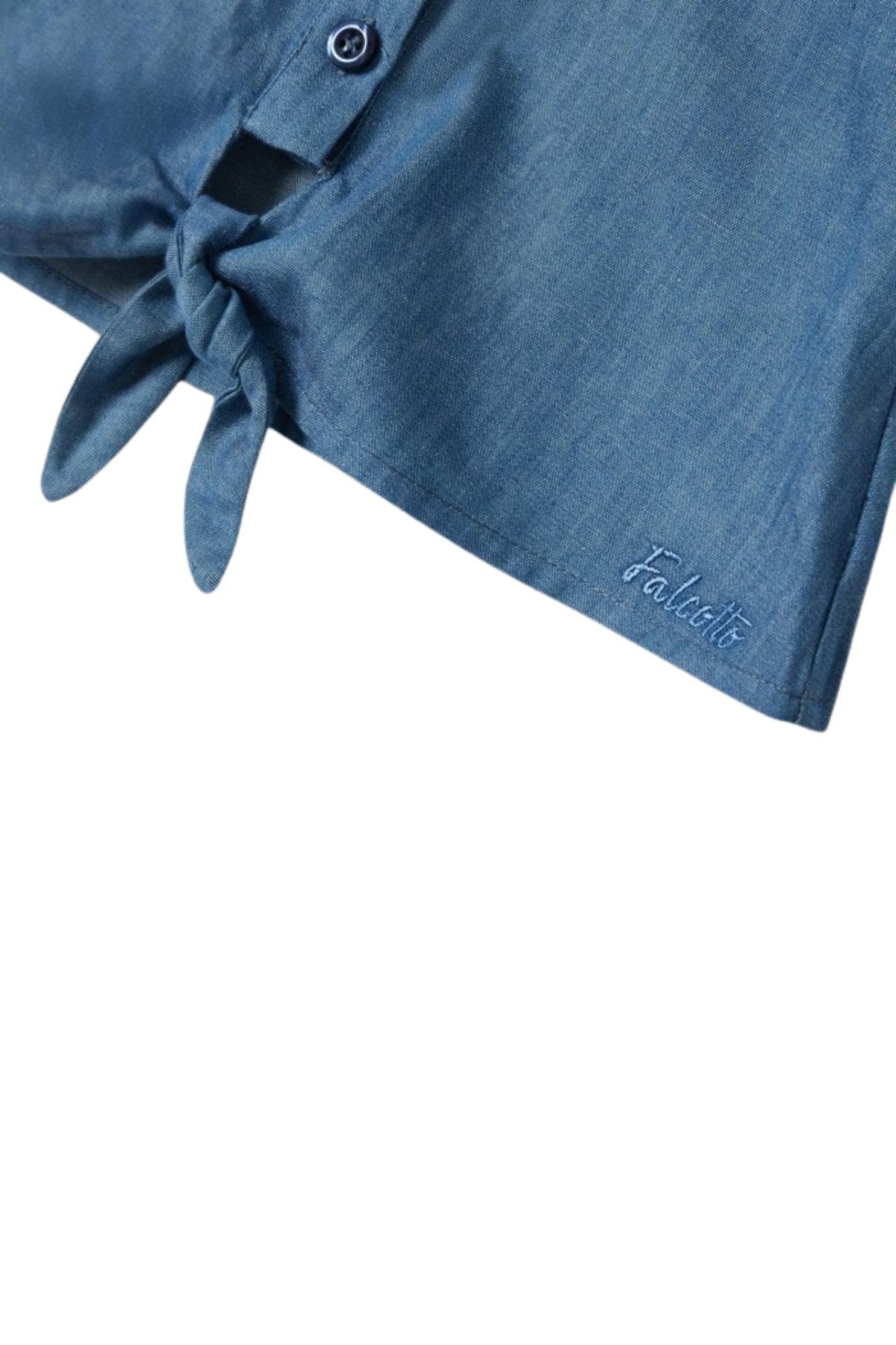 Closure with buttons on the front, with knot on the bottom for a curved effect of the garment
