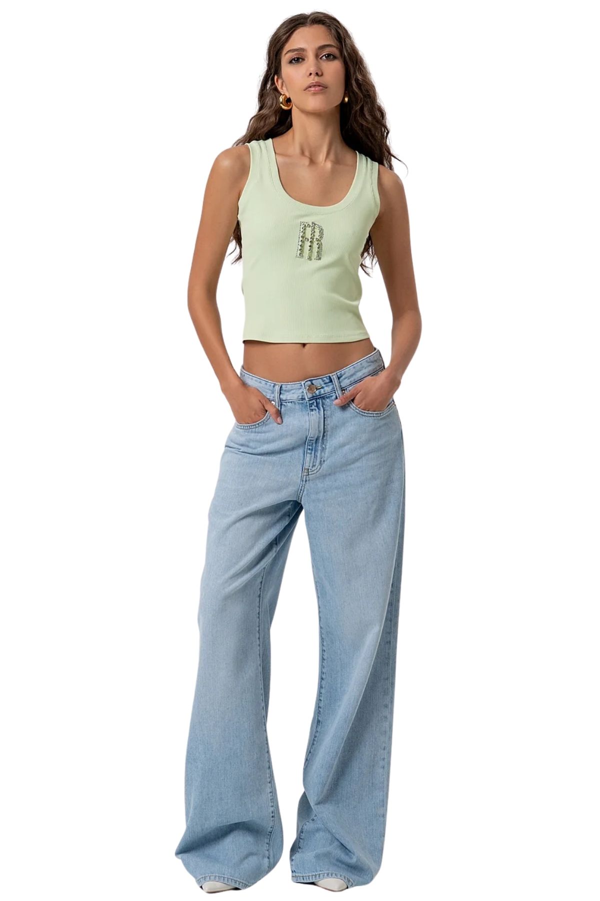 The true focal point of the tank top is the monogram logo applied to the center of the chest, entirely embellished with sparkling crystals and rhinestones. This jewel-like finish transforms a basic piece into a distinctive element, capable of reflecting light with every movement and adding a touch of glamour to even the simplest of outfits.