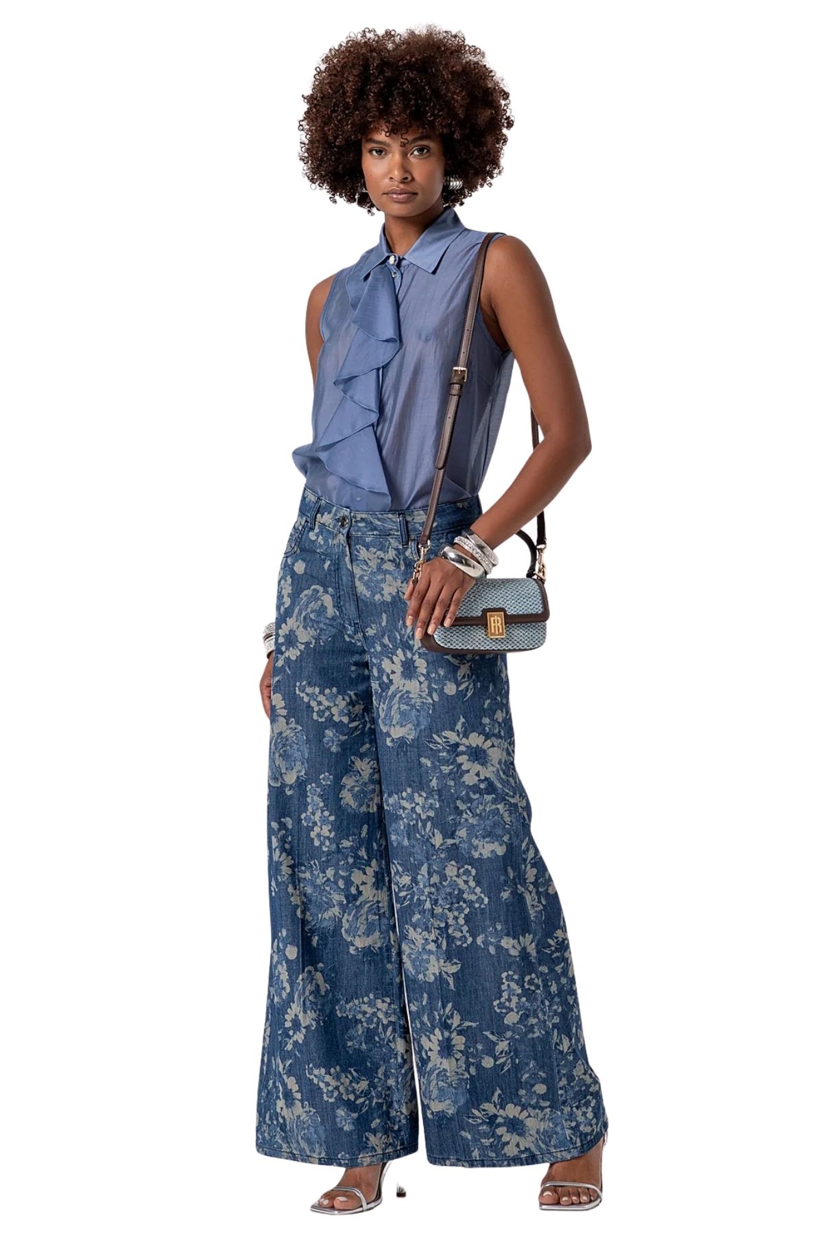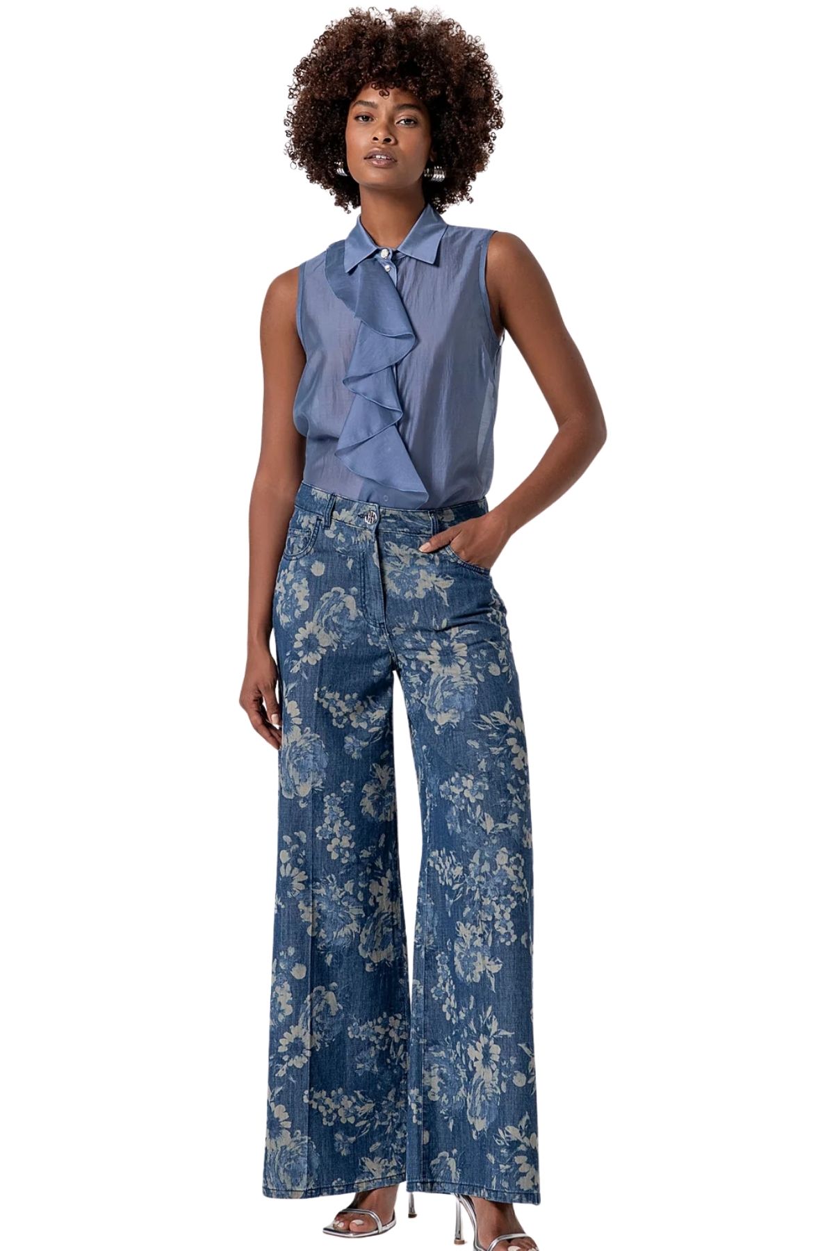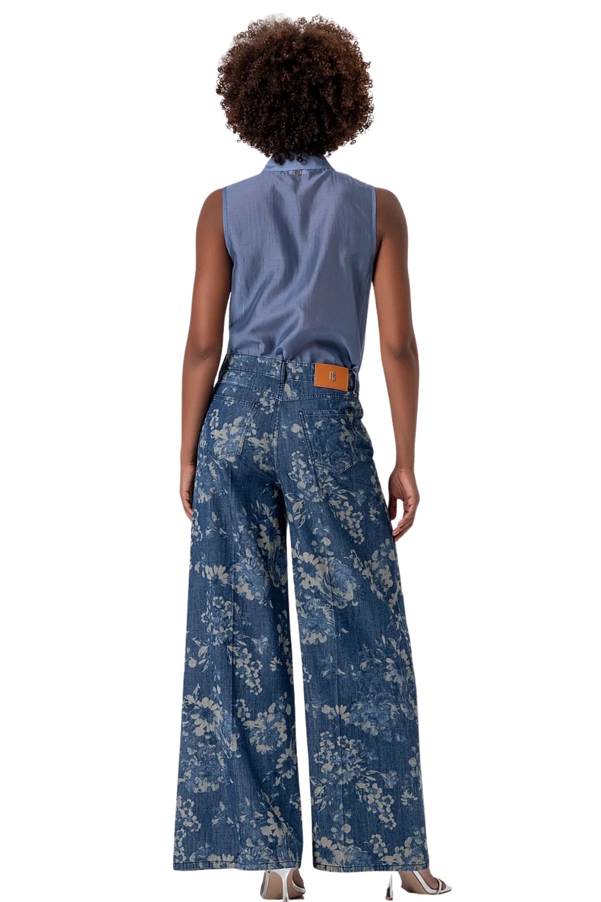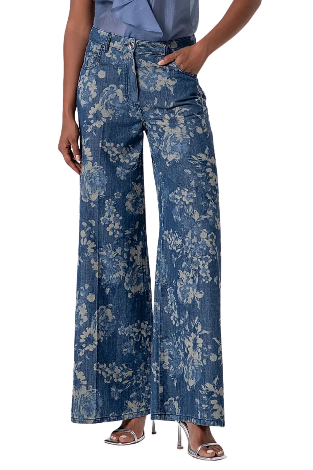 Wide-leg denim flare jeans with a floral pattern