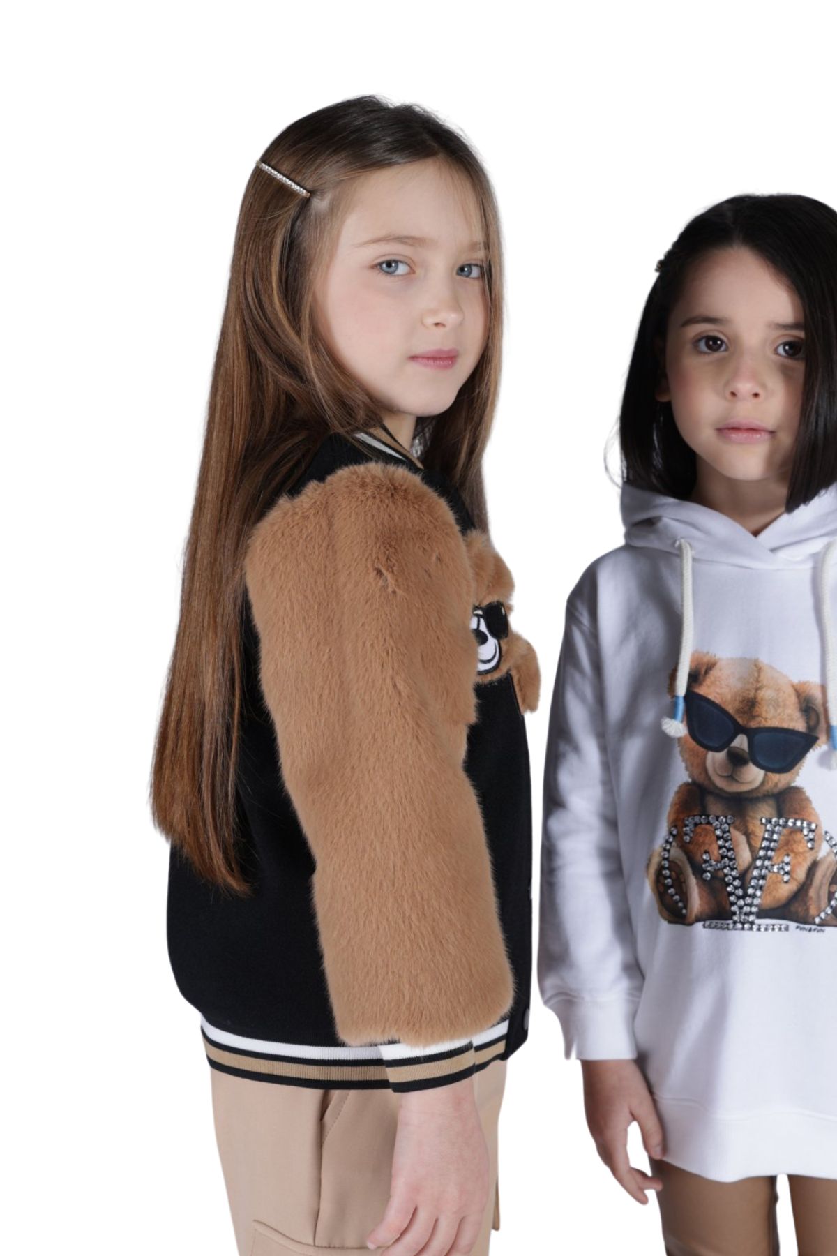 Faux fur patch with teddy bear on right chest