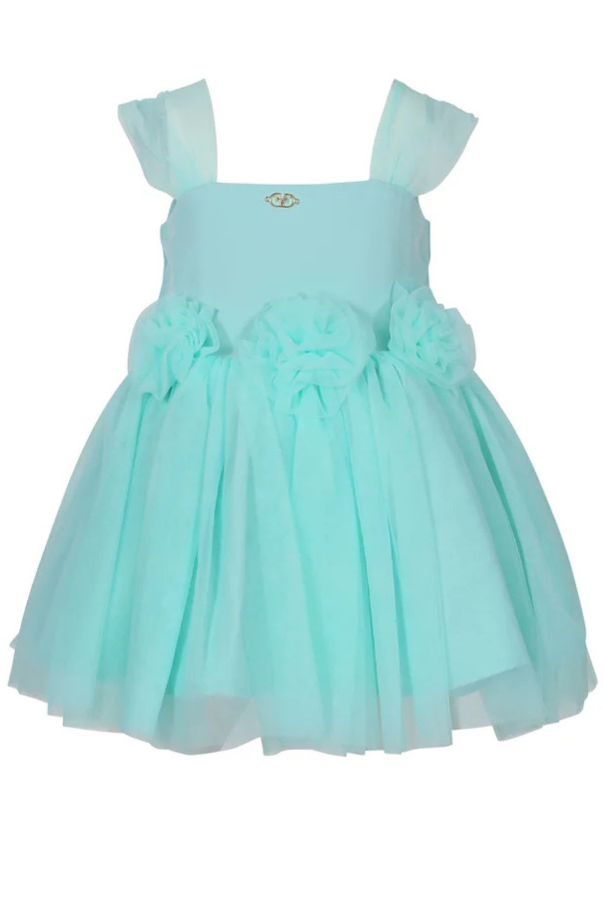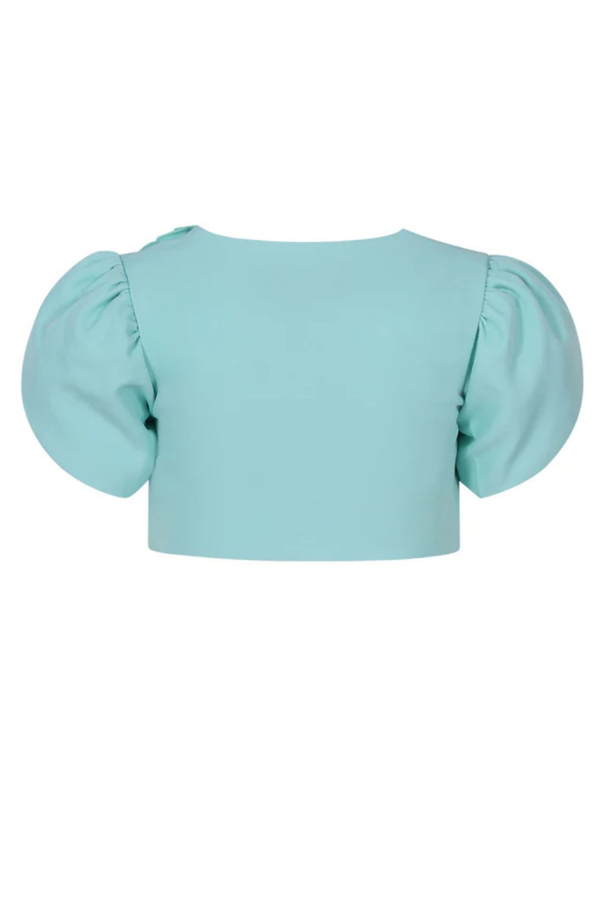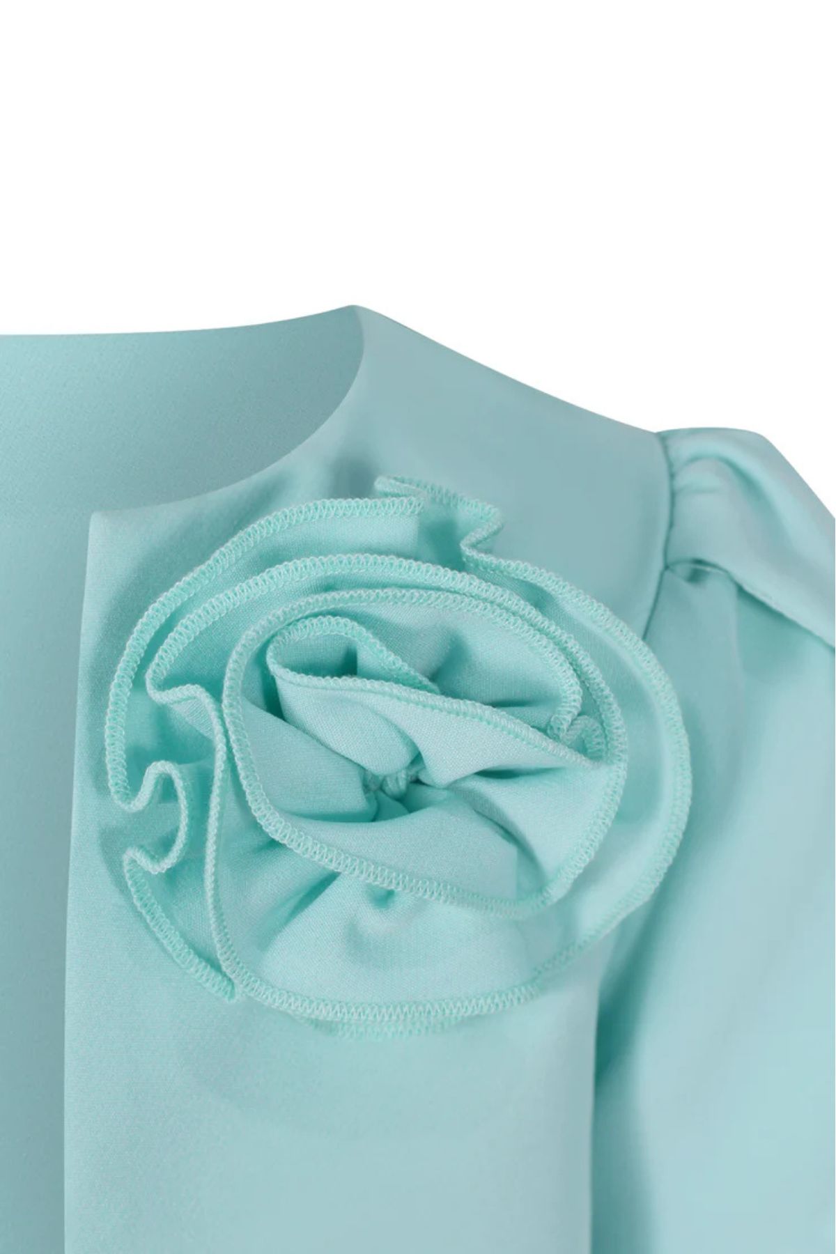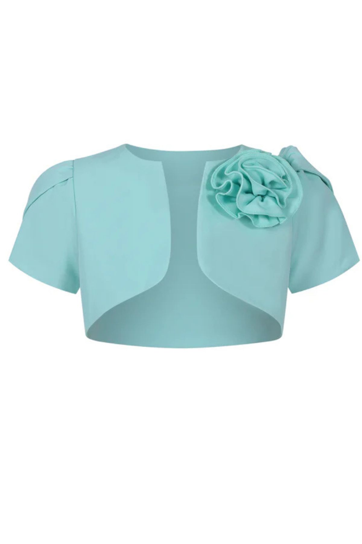Stretch technical fabric jacket with short puff sleeves and a flower