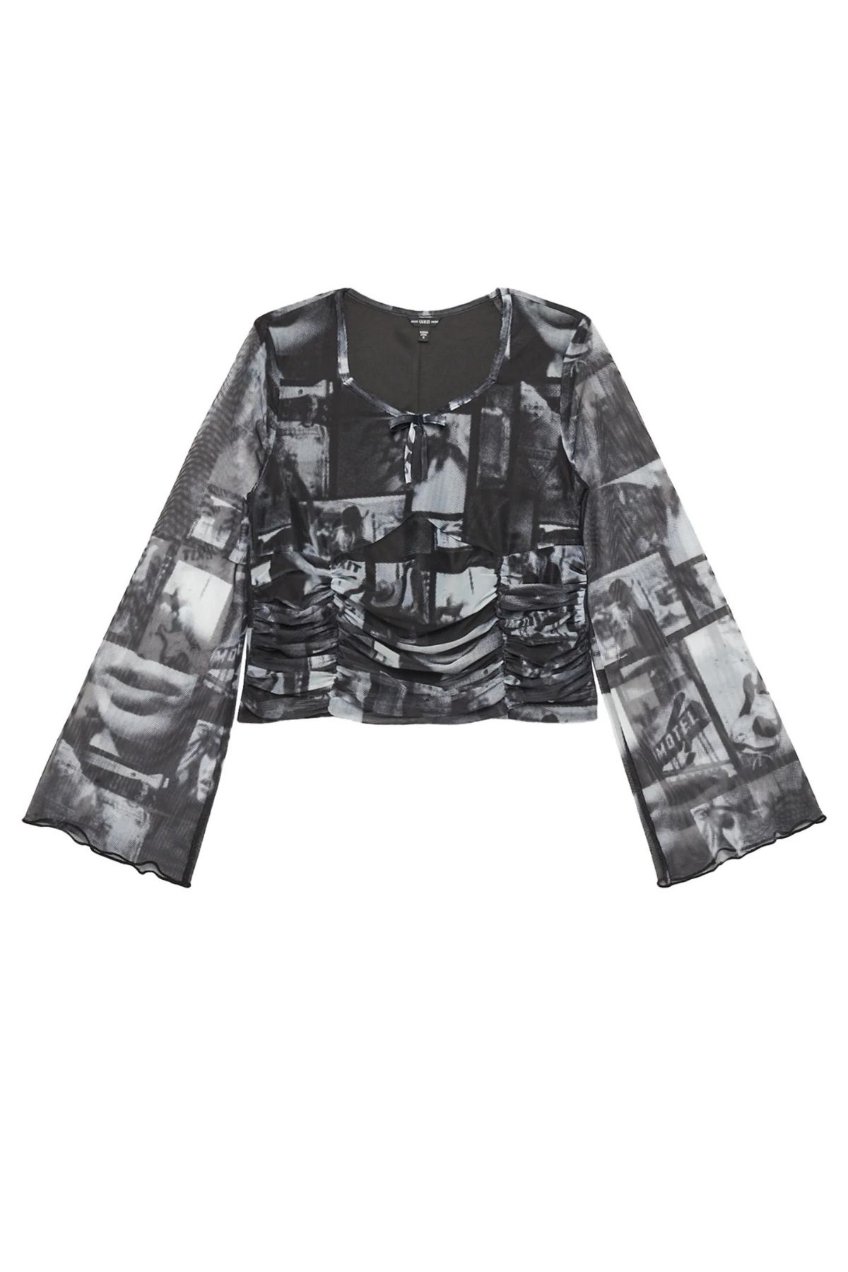 Printed sweater with sheer sleevesWide neckline and all-over printSheer, bell sleevesColor: BlackComposition: 95% Polyester 5% Elastane