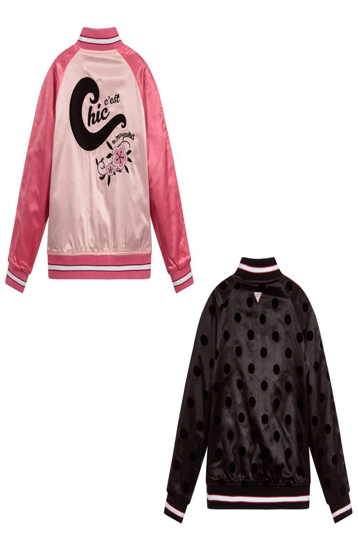 Made in silky soft satin. The pink side has embroidered flowers and the words 'Chic c'est' which means 'chic is' on the back. The black side has a velvet dot pattern and both sides have striped ribbed trim. It is lined with an extra middle layer of fabric for added warmth