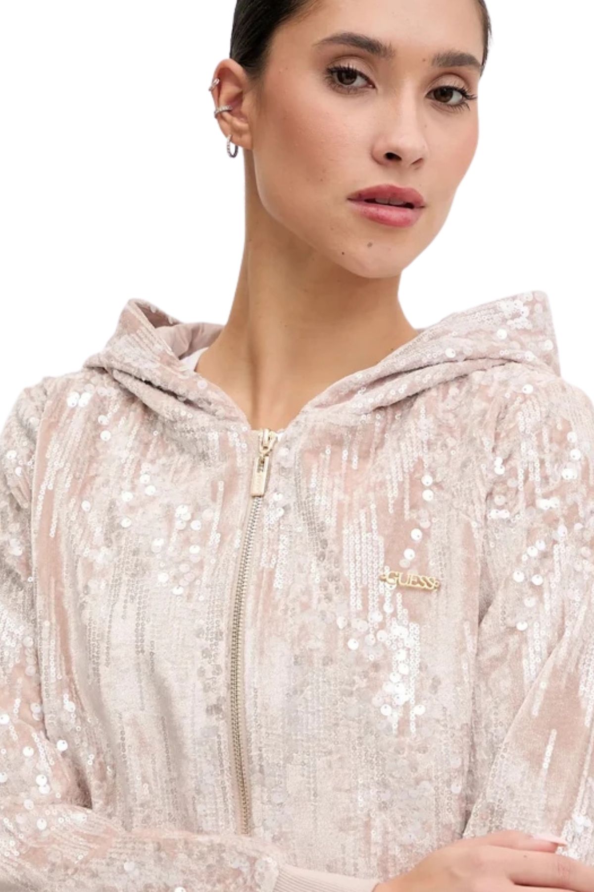 Velvet and sequin zip-up sweatshirtHoodedGold logo plaqueMade of fine stretch knitPolyester ensures greater wrinkle resistance