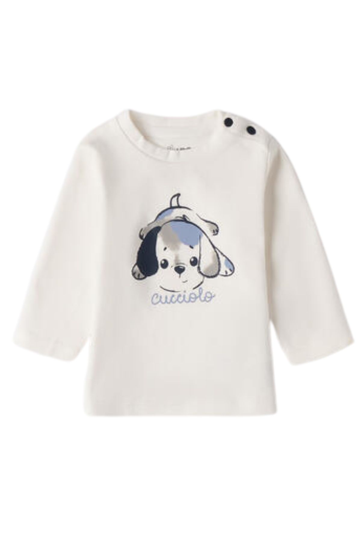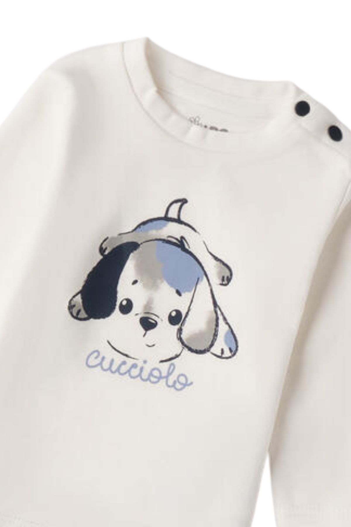 The model features a shoulder opening with snaps for easy changing and dressing, and a solid color with a puppy print.