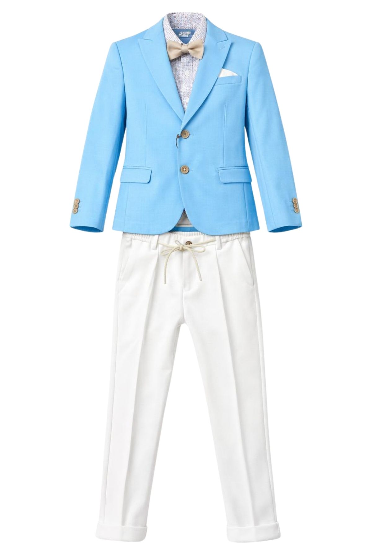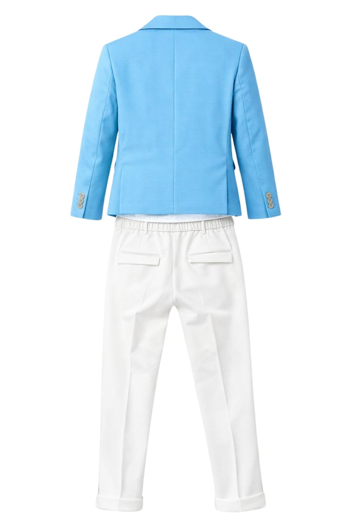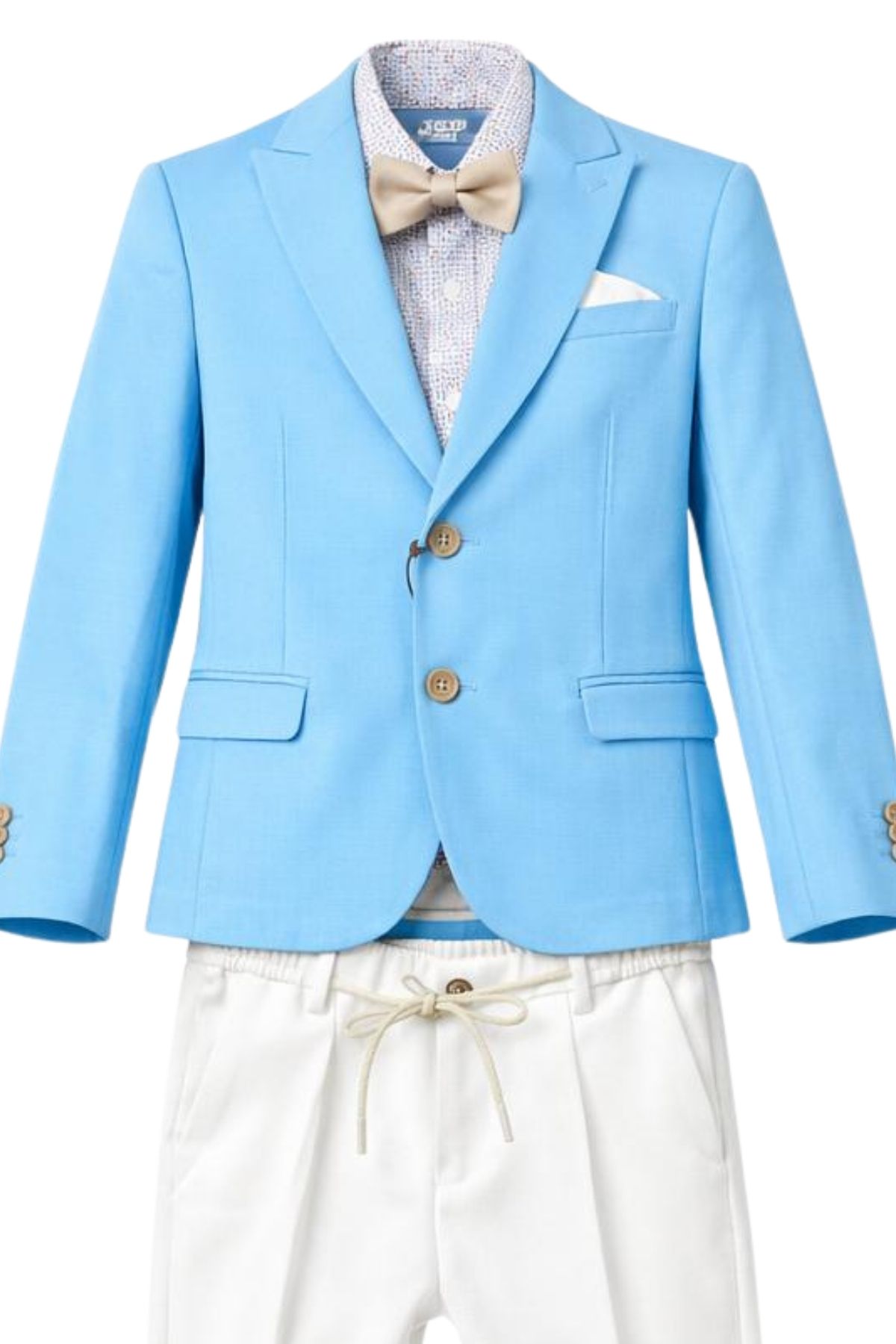 Light blue single-breasted jacket with front patch pockets and a white pocket square.