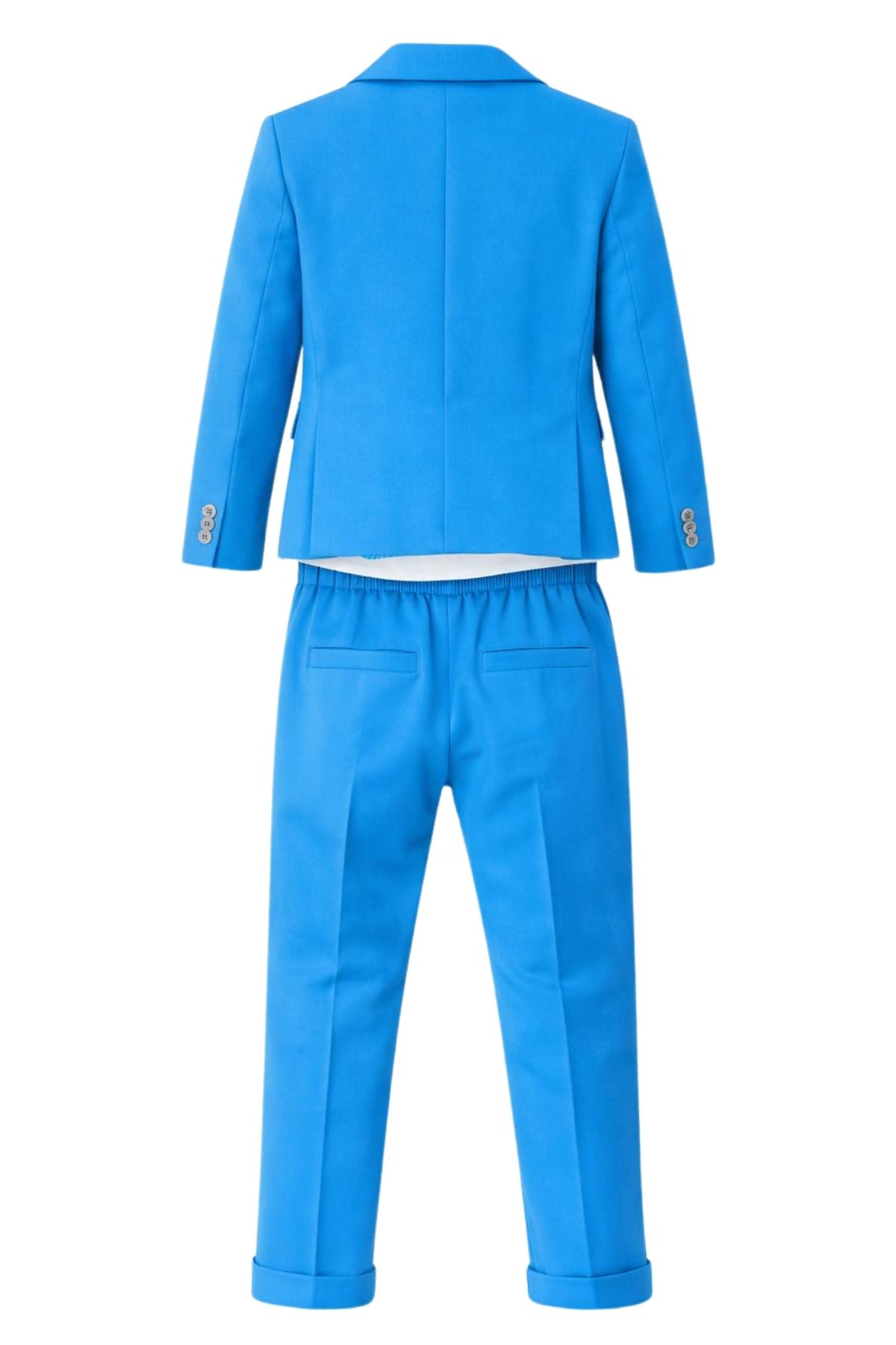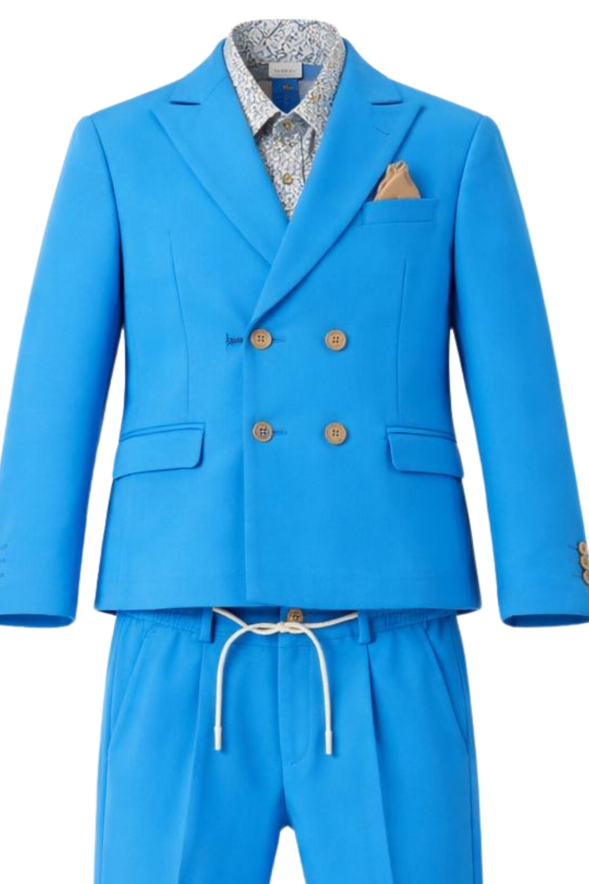 With a double-breasted jacket in a vibrant shade of turquoise, featuring four contrasting brown buttons and wide peak lapels