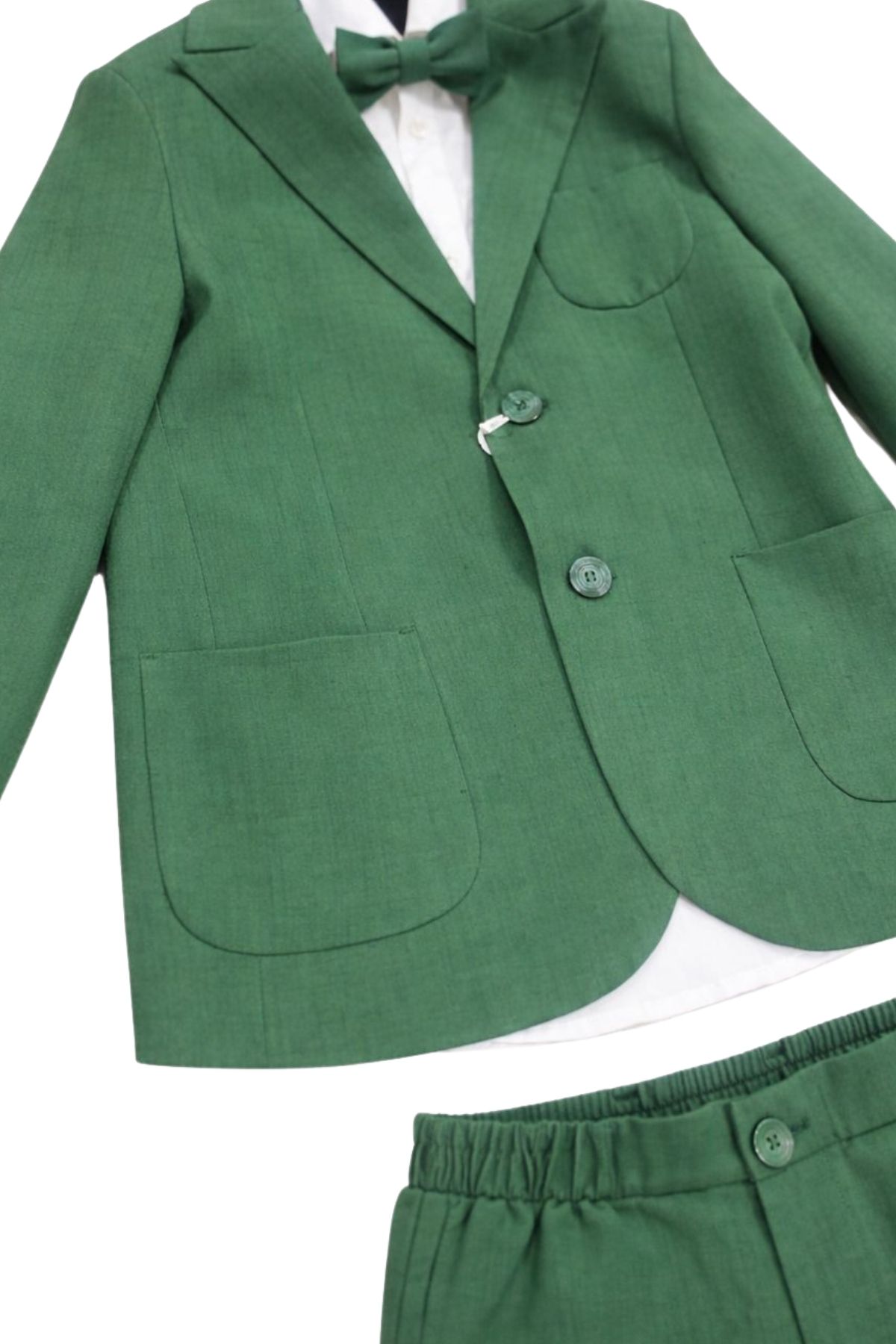 A matching bow tie in the same shade of green as the jacket.