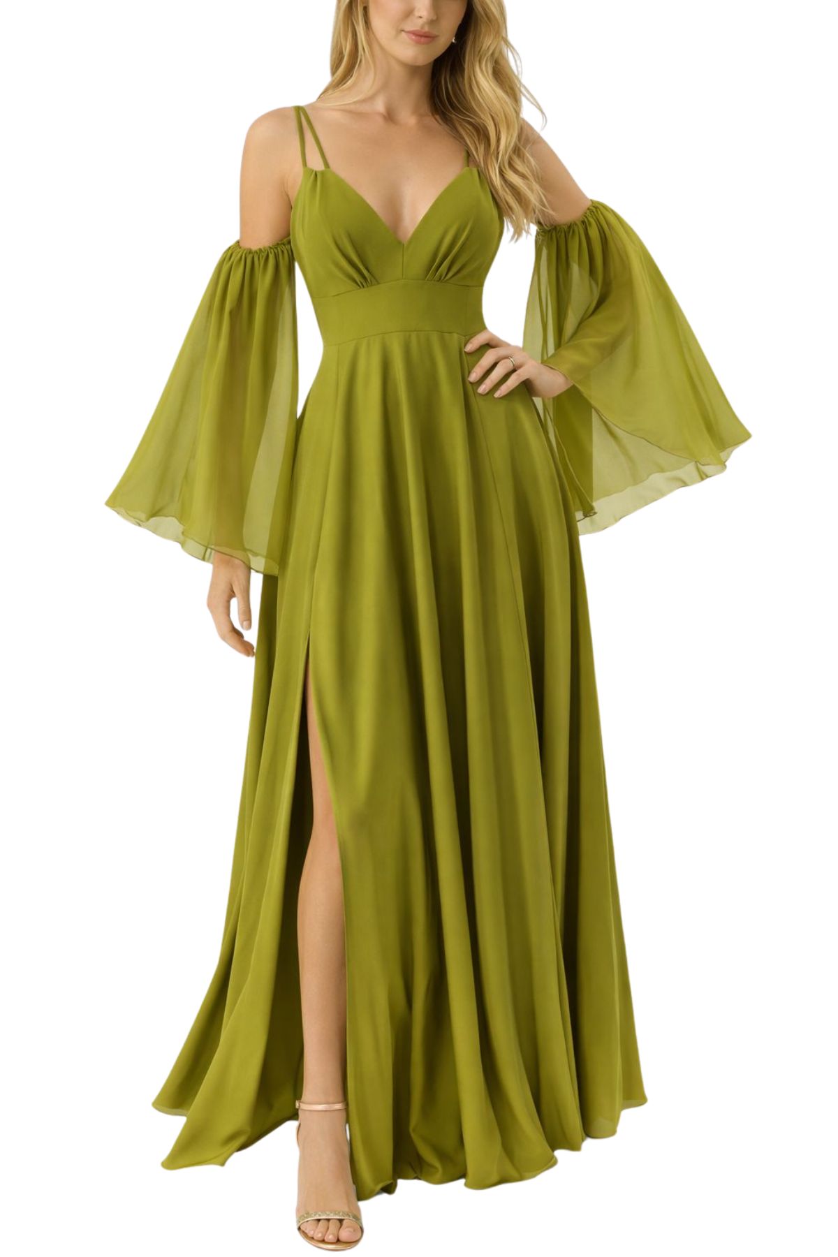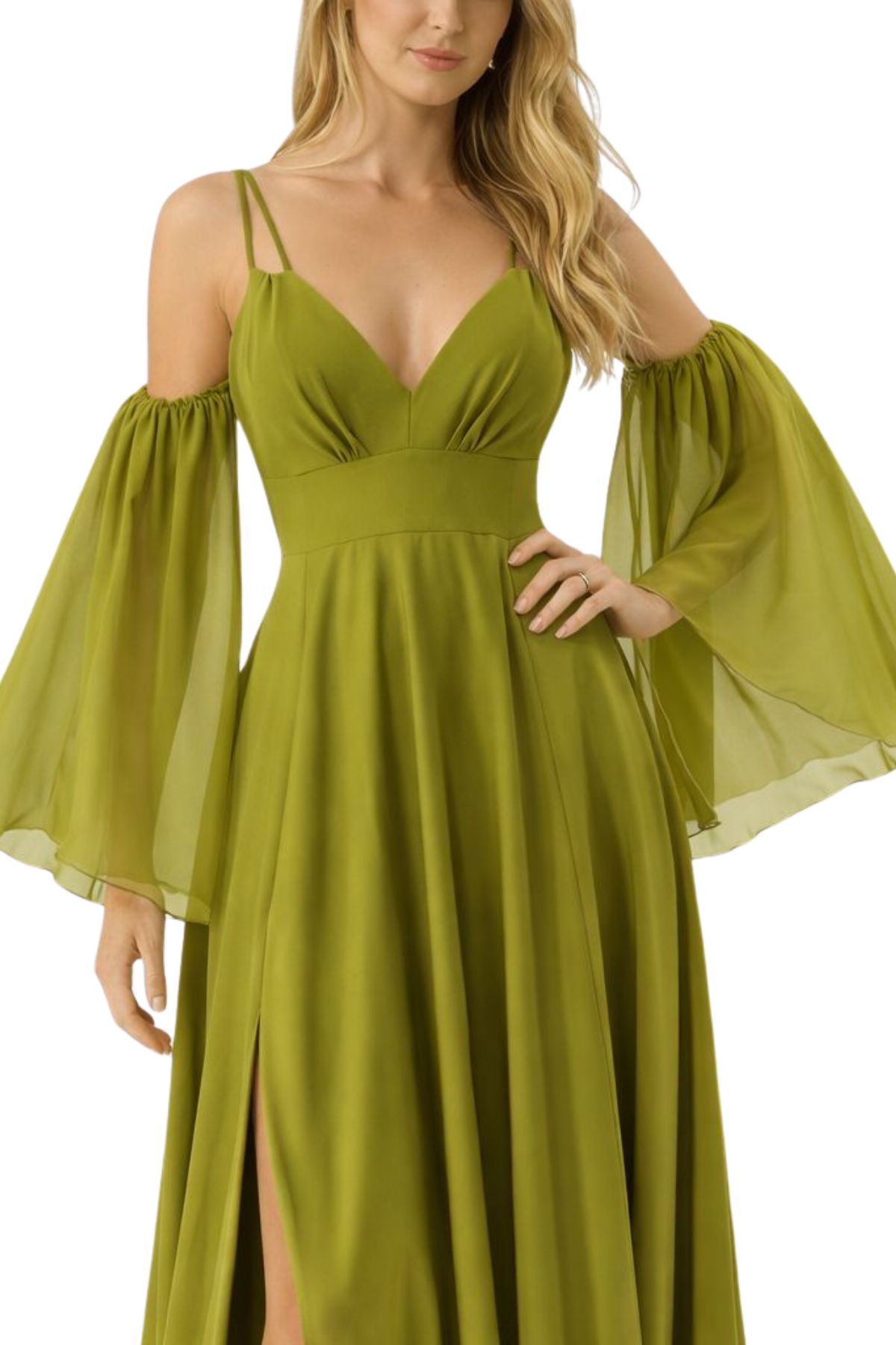 It features distinctive off-the-shoulder cape sleeves, giving it an ethereal feel