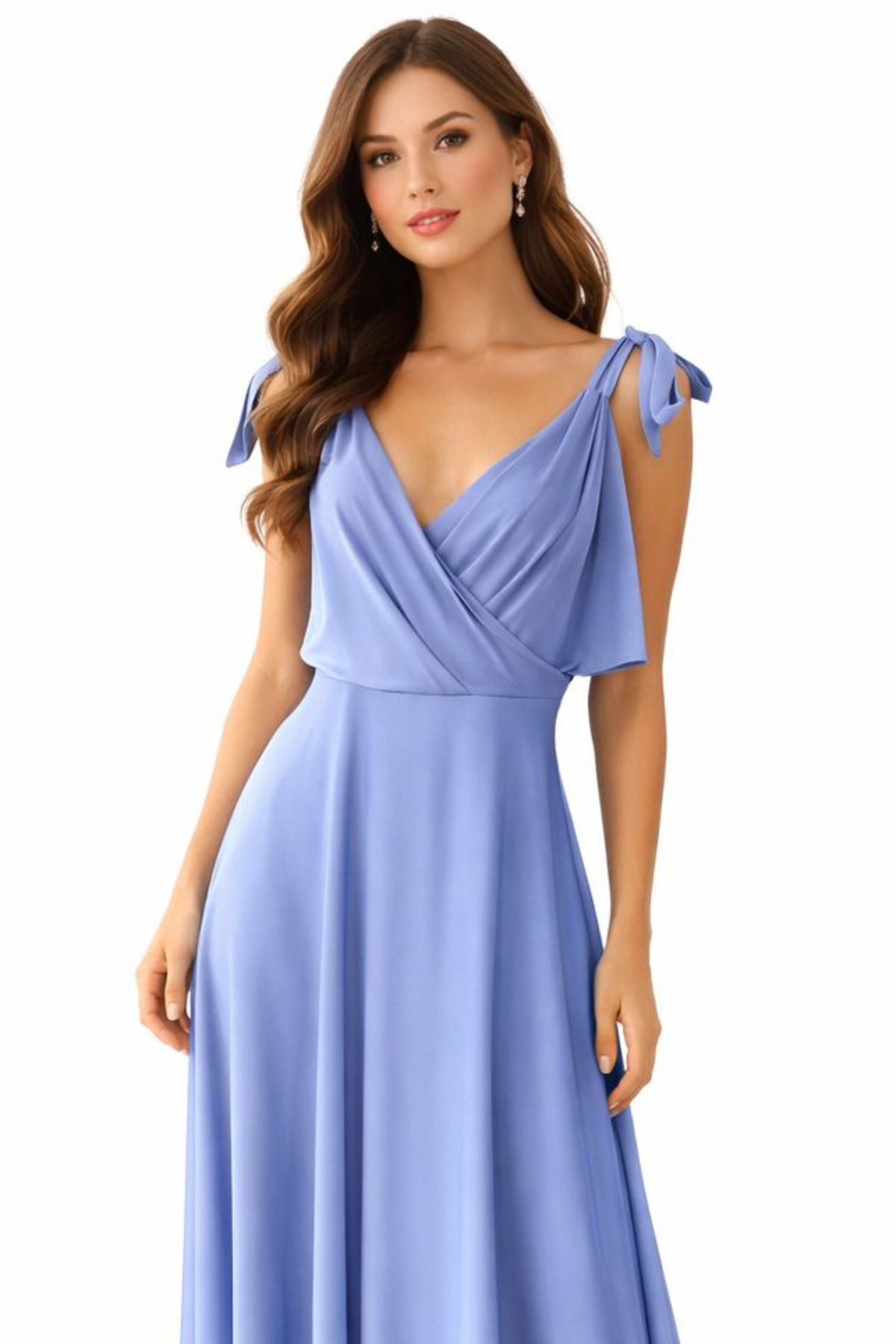 Tied straps with large bows on the shoulders add a romantic and feminine detail
