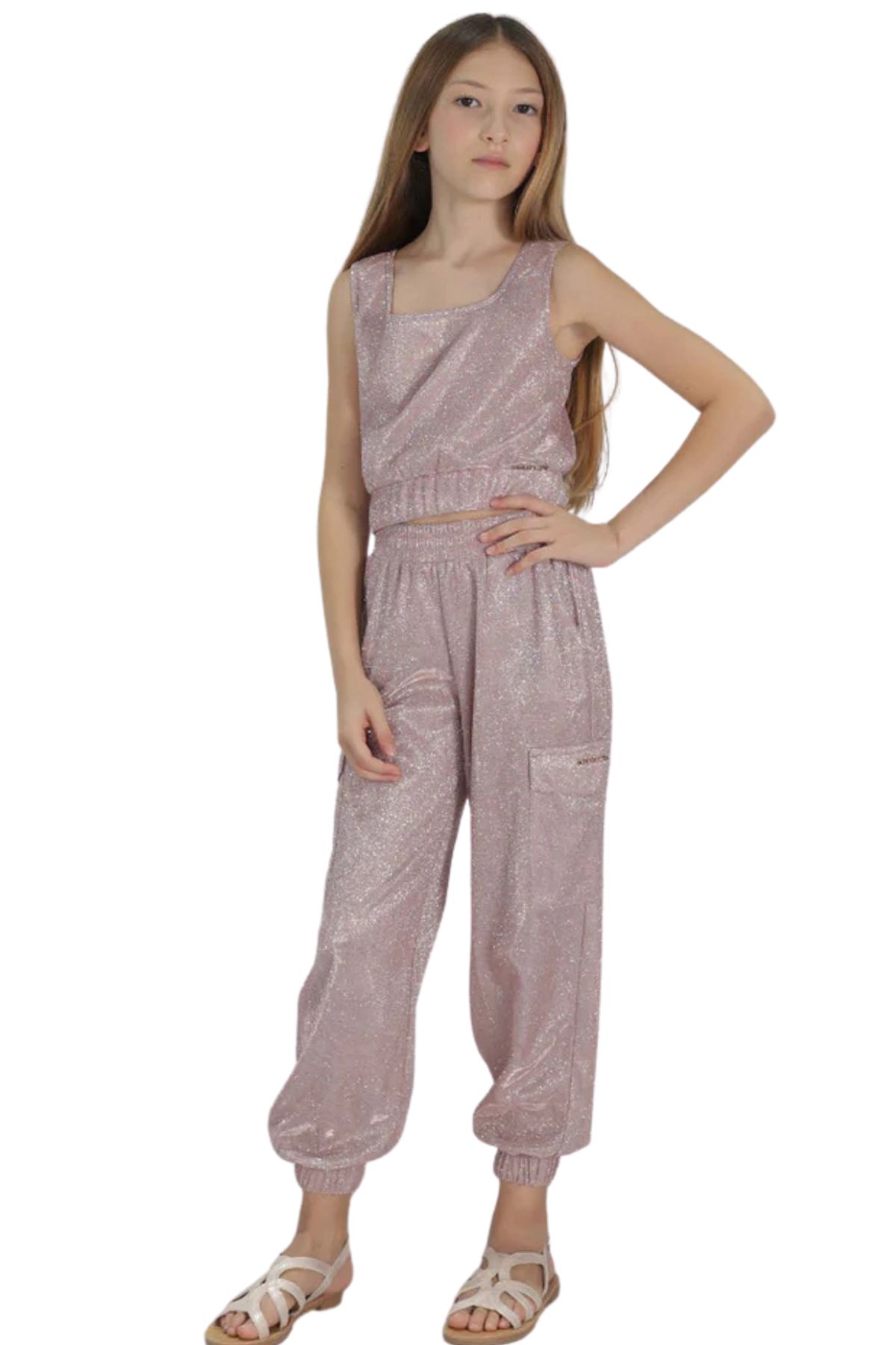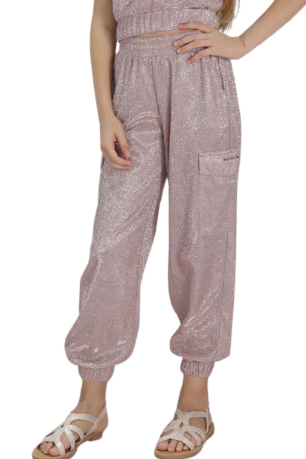 Featuring a shimmering fabric, crafted from a soft fabric enriched with micro-glitter and lurex threads for a luminous, shiny effect.