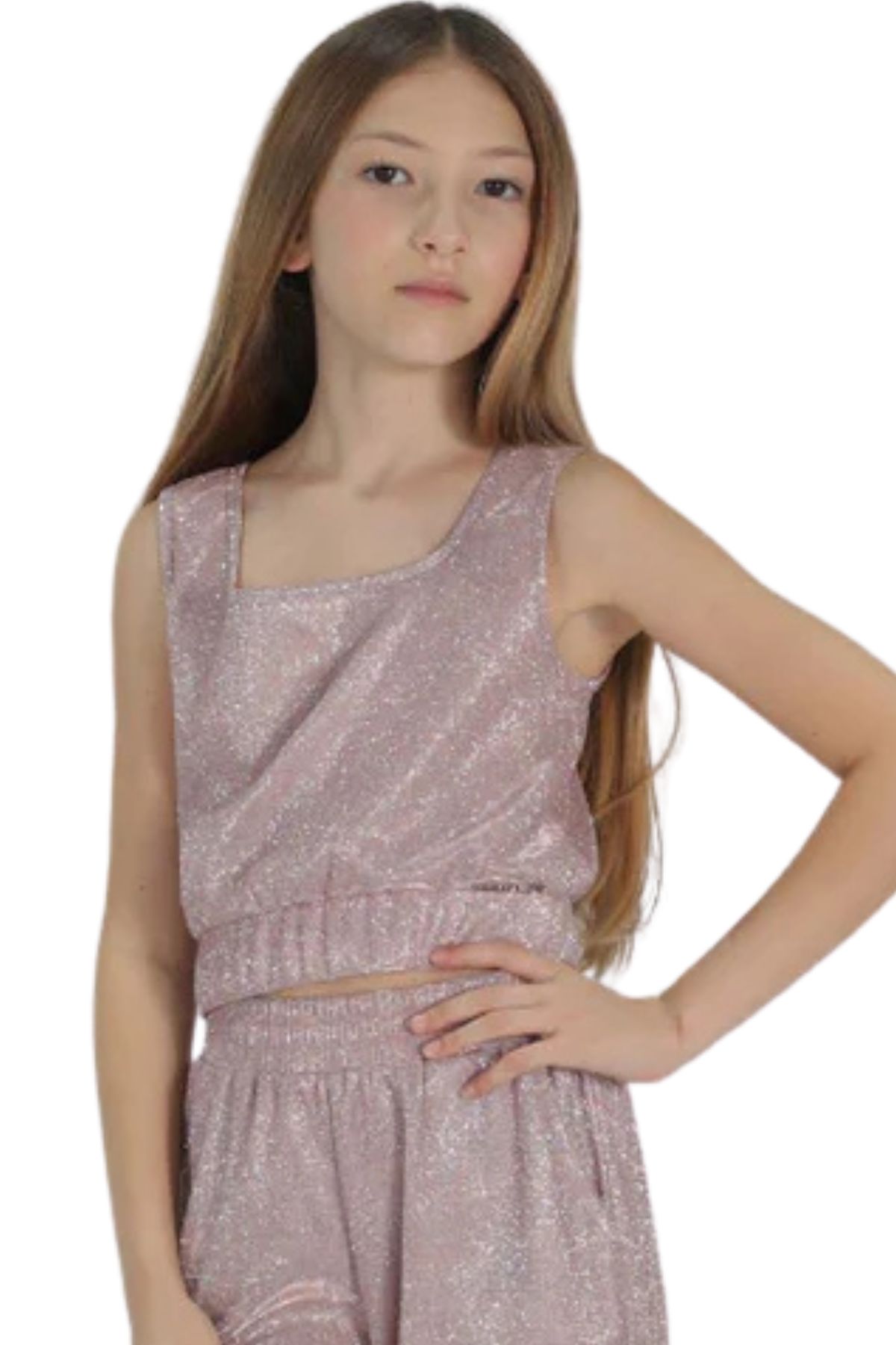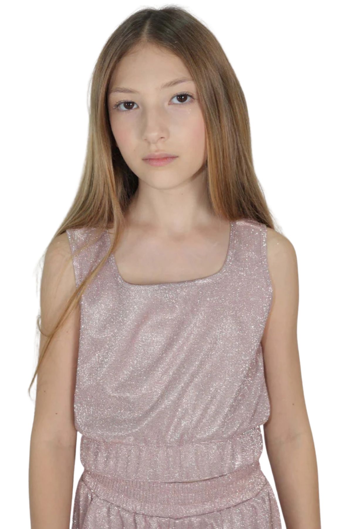 Sleeveless, with a square neckline and a straight fit. It's made of a soft fabric enriched with micro-glitter and lurex threads for a luminous, shimmering effect.