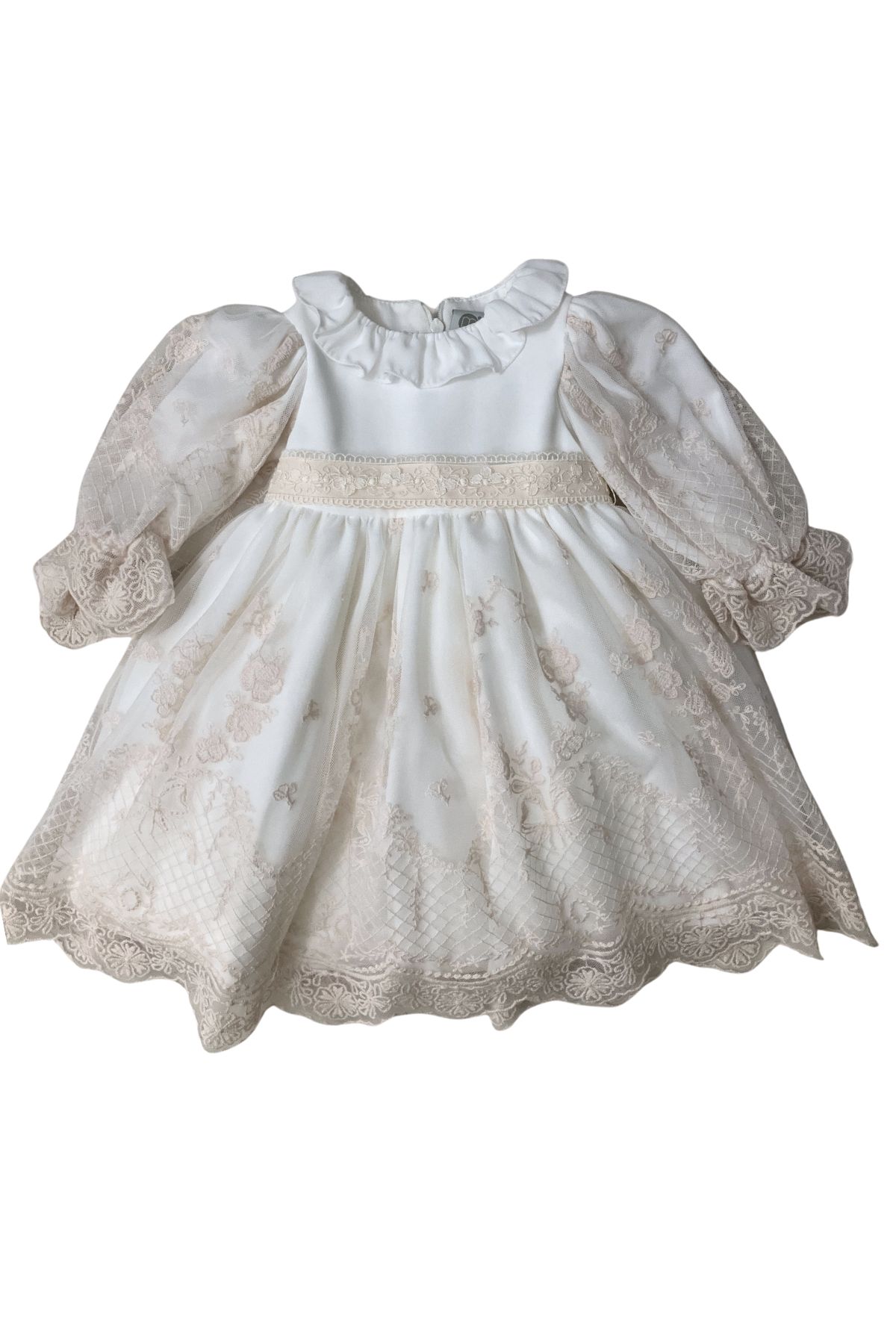 Vanilla dress in powder pink lace Ruffle collar Long puff sleeves Back zipper closure Embroidered floral lace on tulle with a mesh motif Lined 100% Made in Italy
