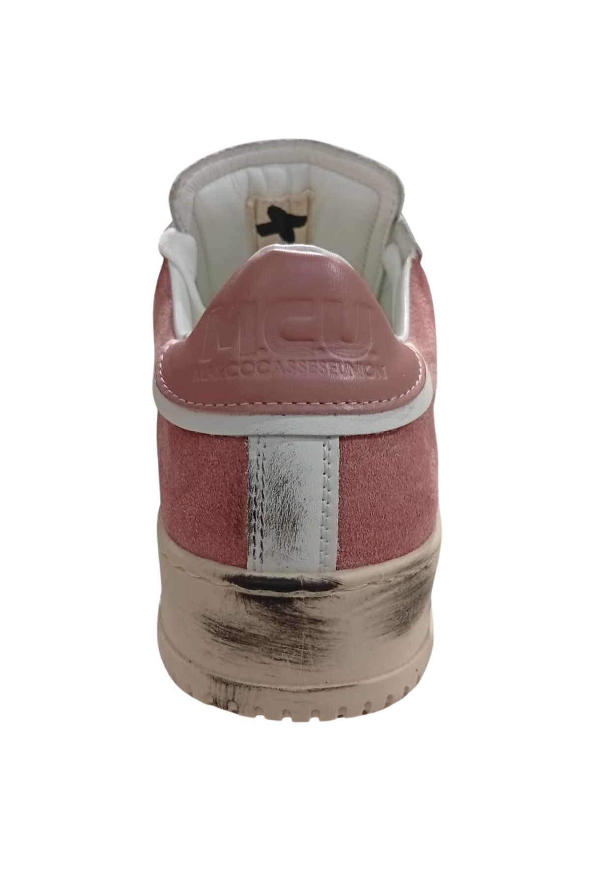 Low-top sneakers in white leather with a used effect and pink logo on the outside and rubber sole.