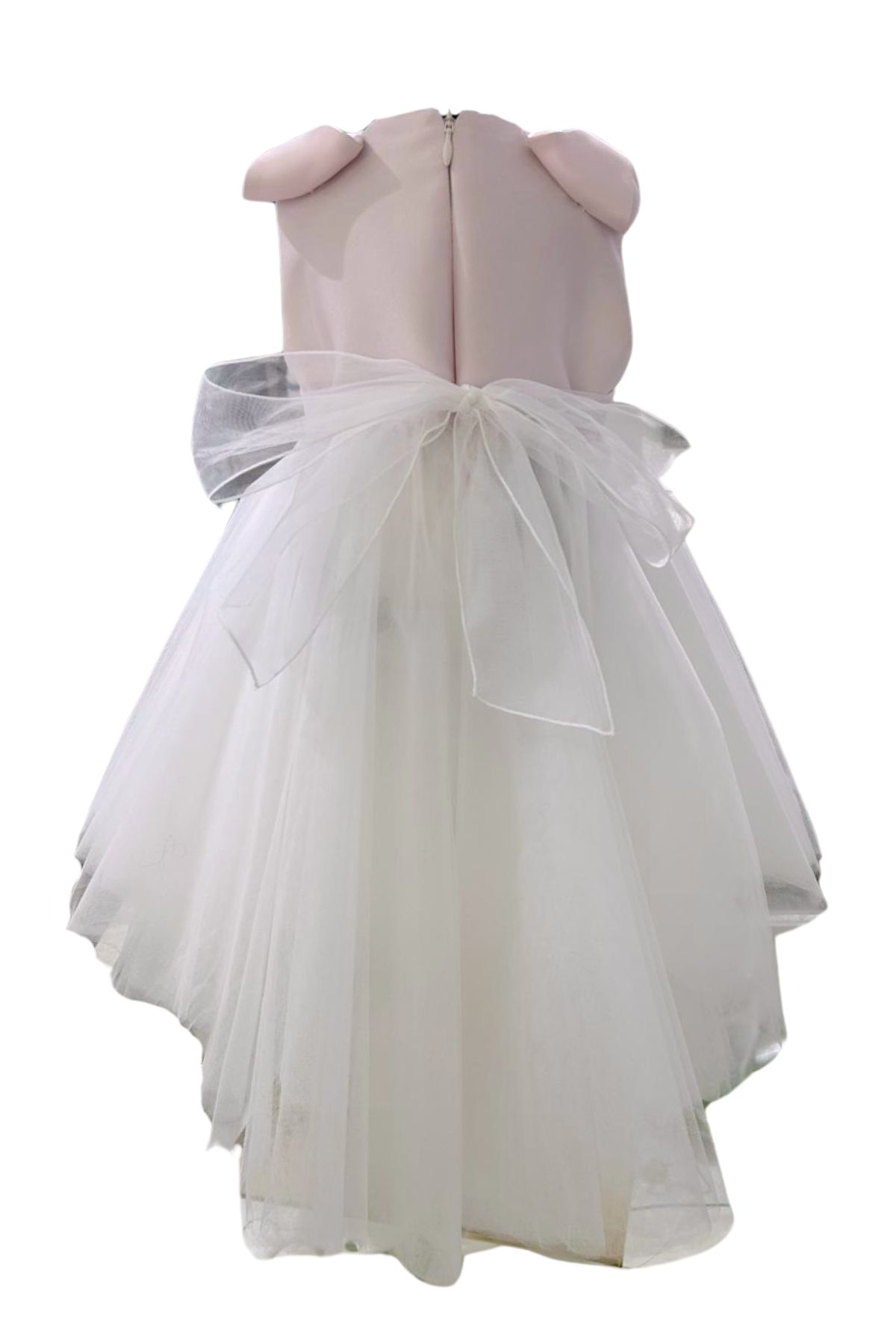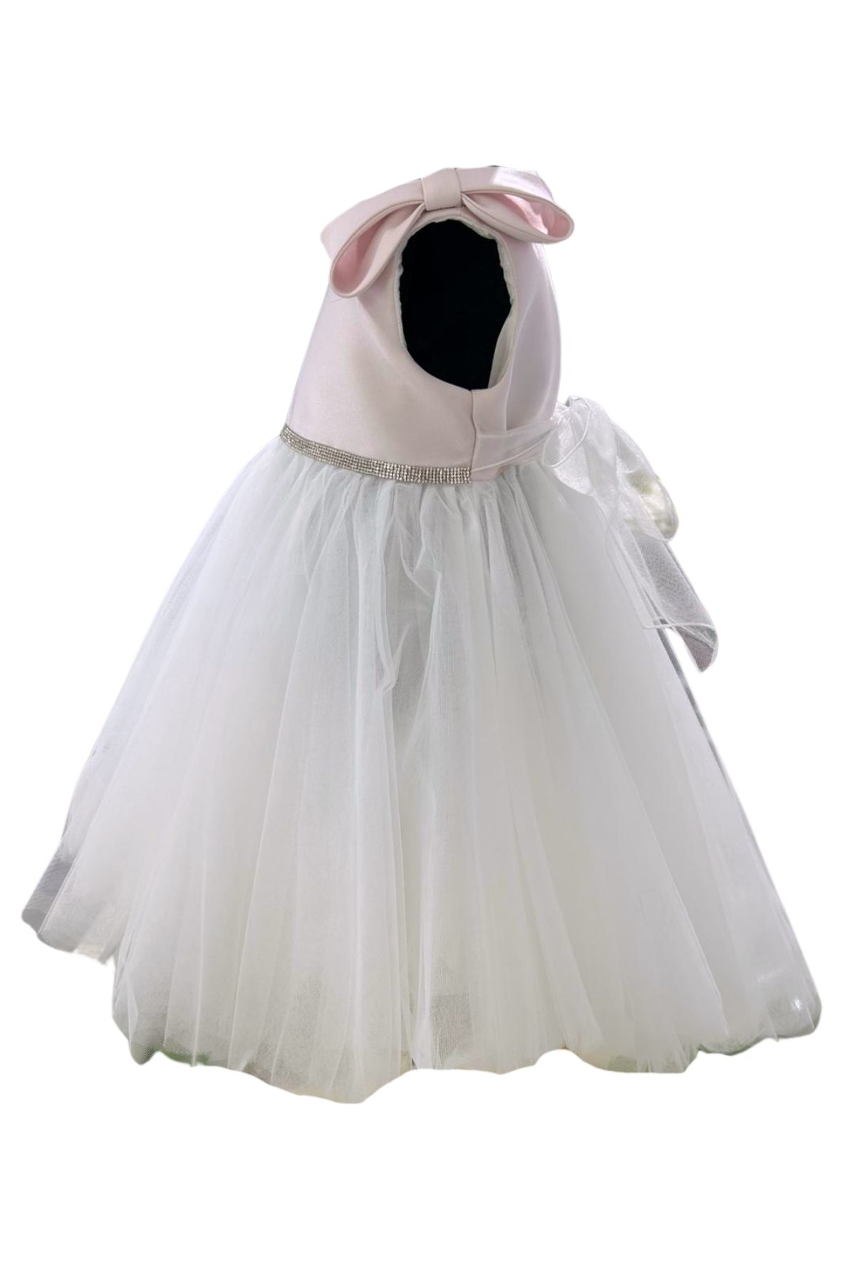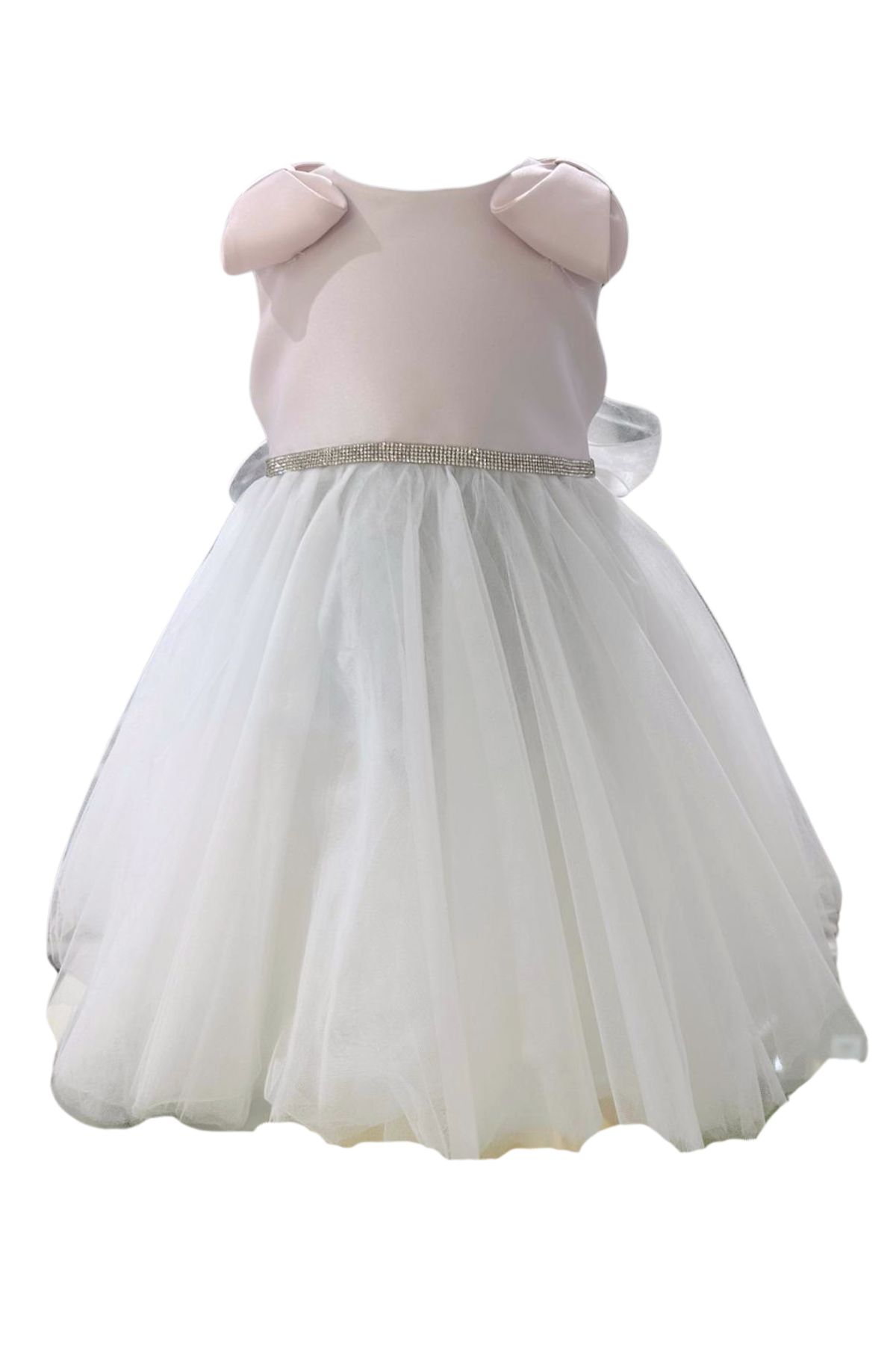 Pink bodice, crew neck and armholes, with large bows on the shoulders