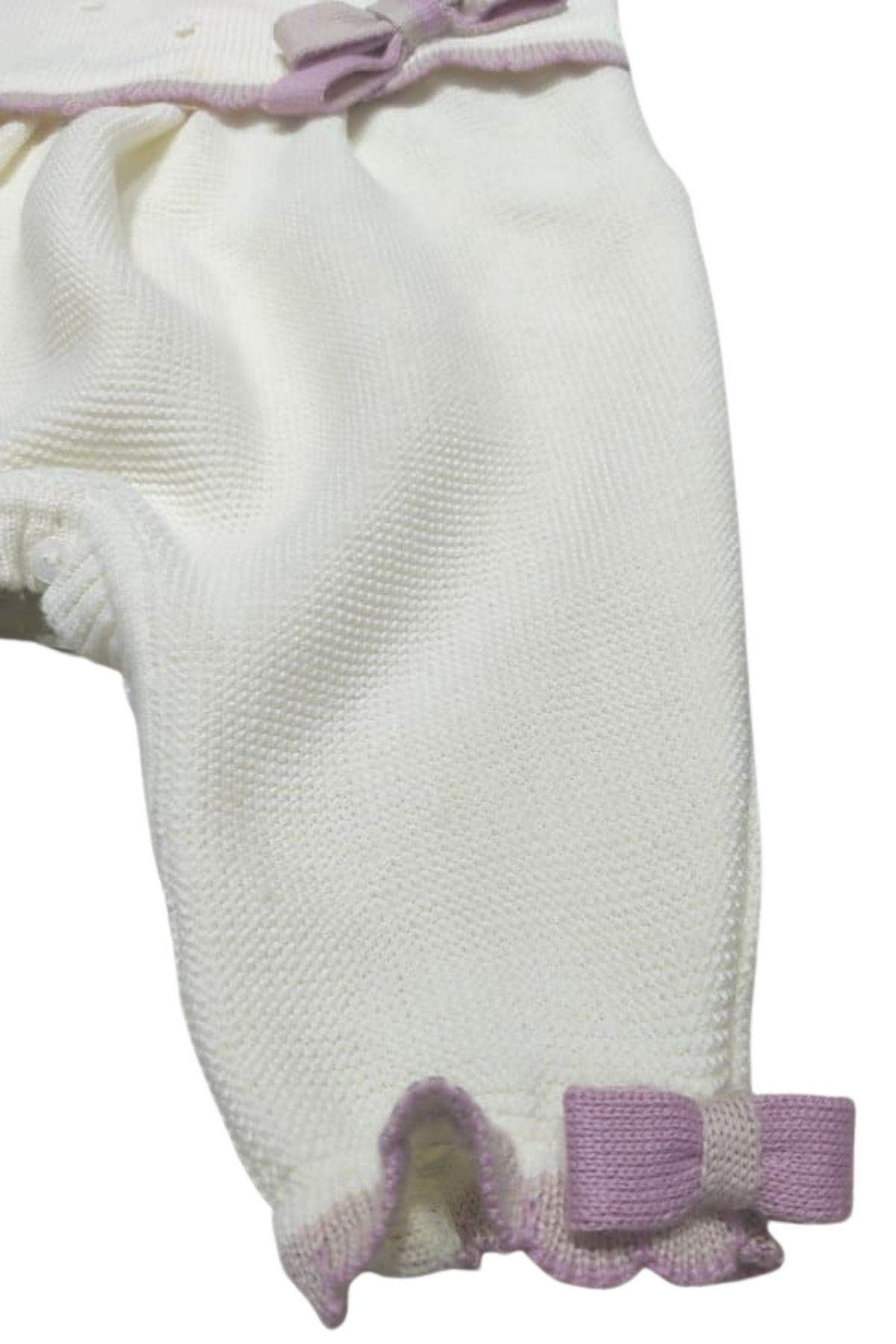 Wool playsuit with texture on the top, satin collar with pink hem, rhinestone logo, bow details, button closure on the back and between the legs