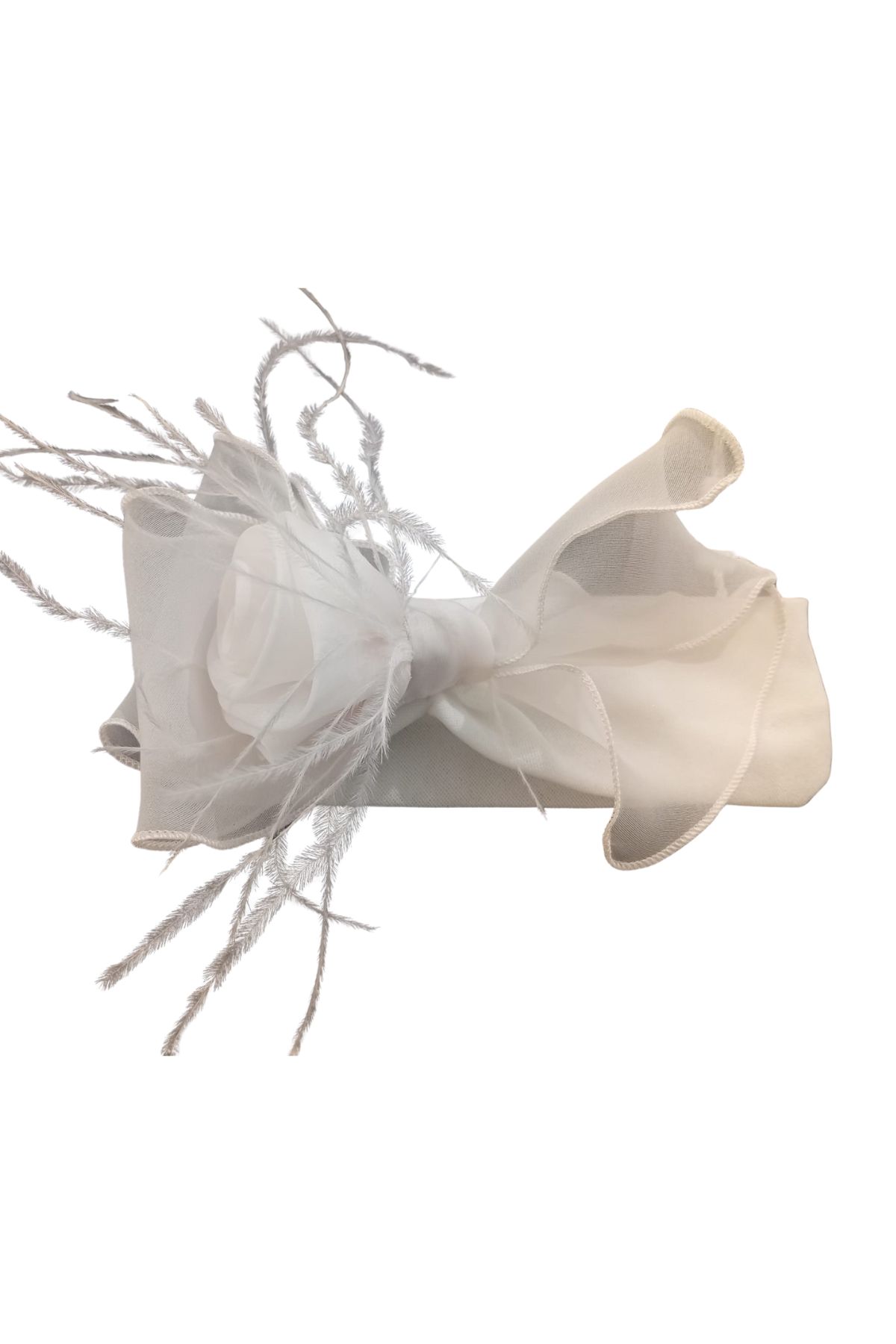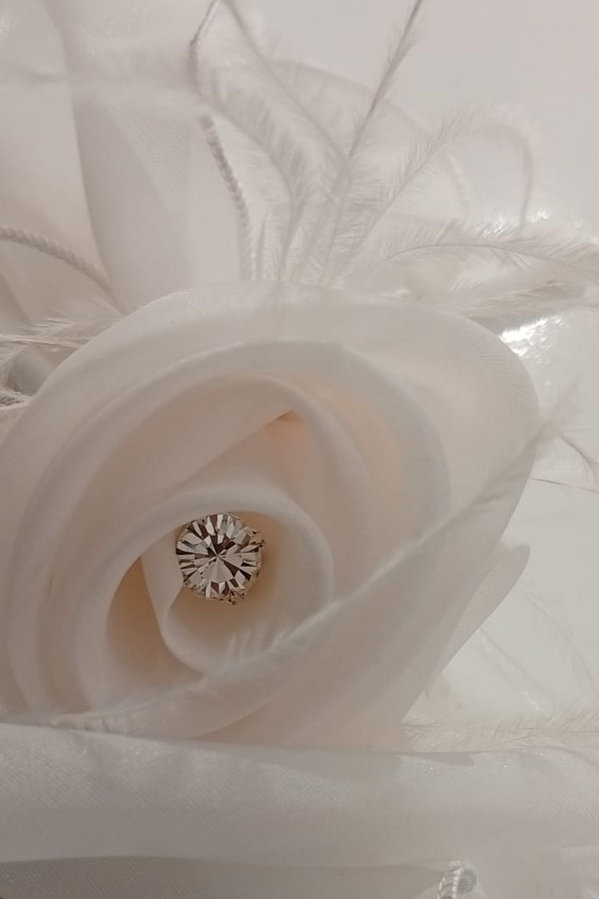 Made of stretchy white tulle, with a large side bow with feather details and a light pink rhinestone flower inside.