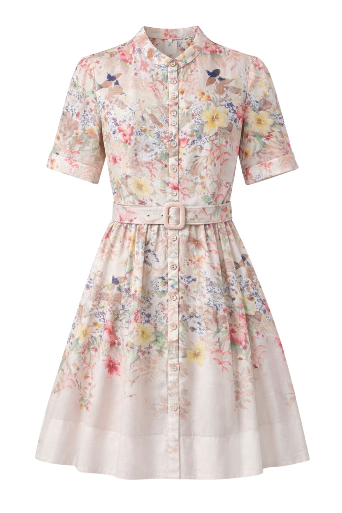 It is completed with a matching belt with a rectangular buckle that defines the waist.