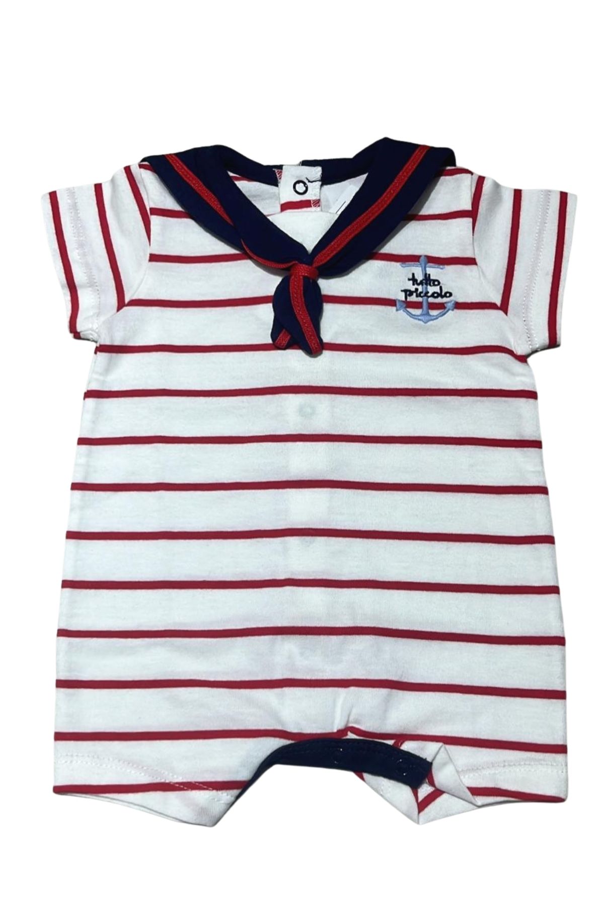 Sailor romperWith collar and sailor knotLogo embroidered on the chestRed striped patternIn fresh summer cotton