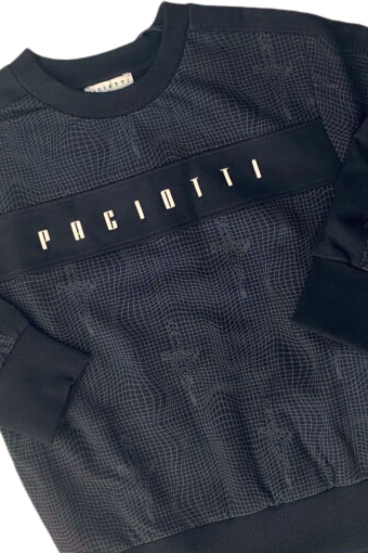 Felpa nera girocollo, con stampa rete avanti e sul retro e simbolo spada del logo, scitta del logo in contrasto
