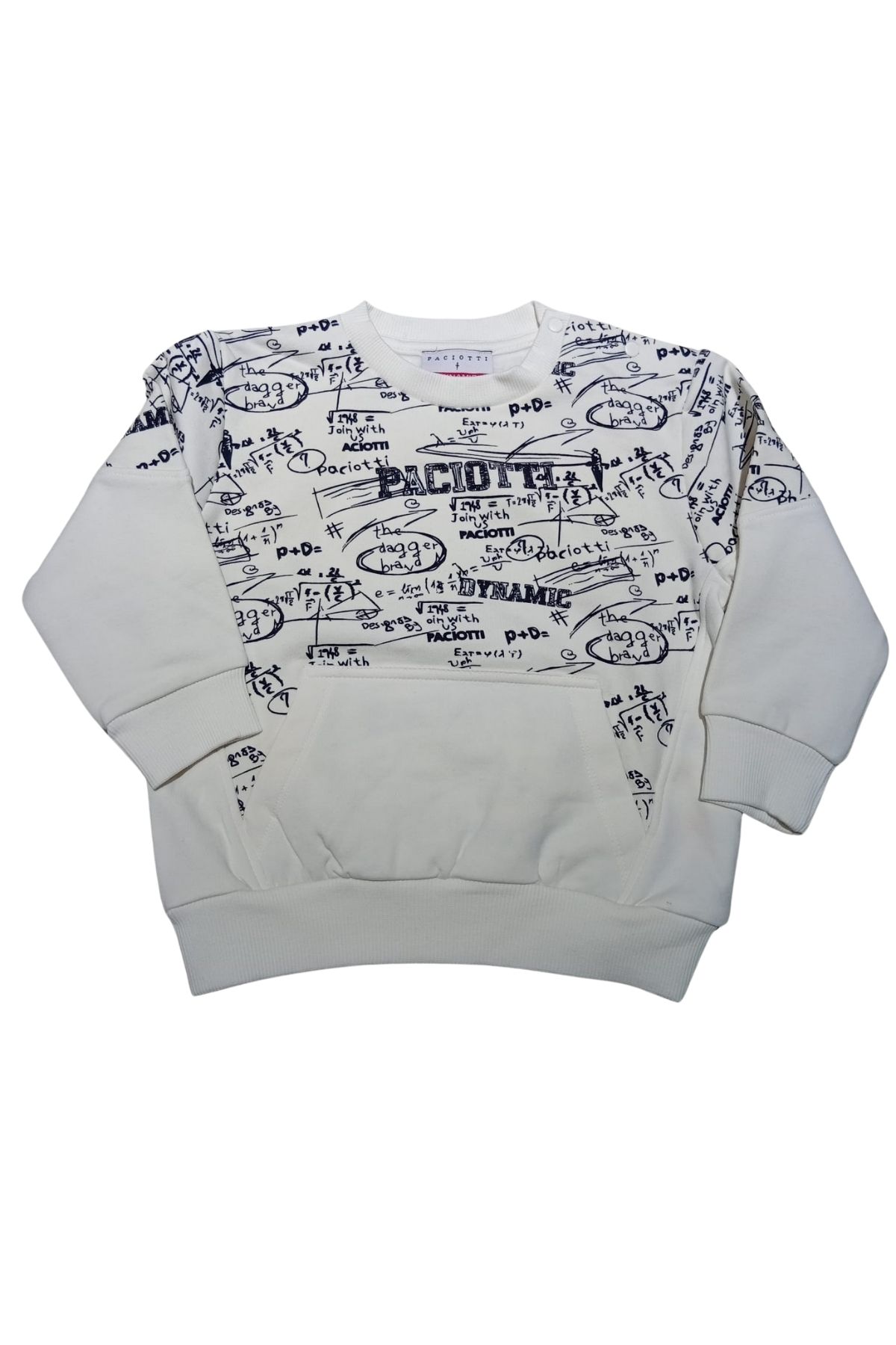 Felpa bianca girocollo, con stampa blu frontale, orlo a coste, tasca a canguro frontale