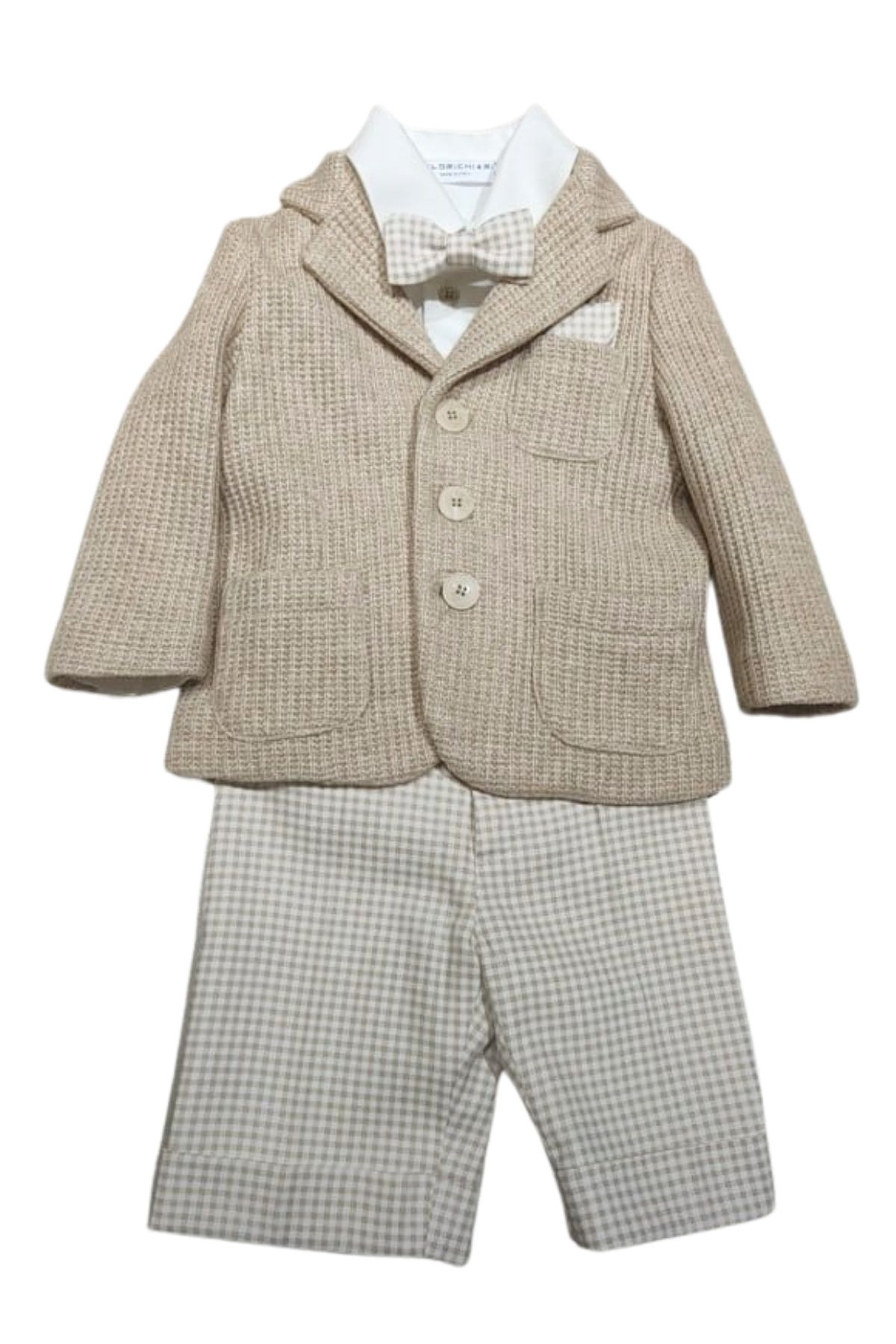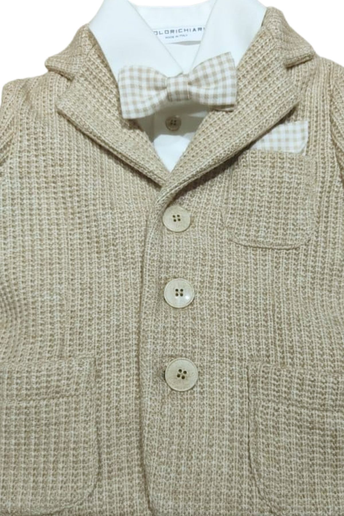 Giacca nocciola in lavorata a maglia con revers, taschino con pochette fantasia quadri, due taschini sul davanti, chiusura con tre bottoni