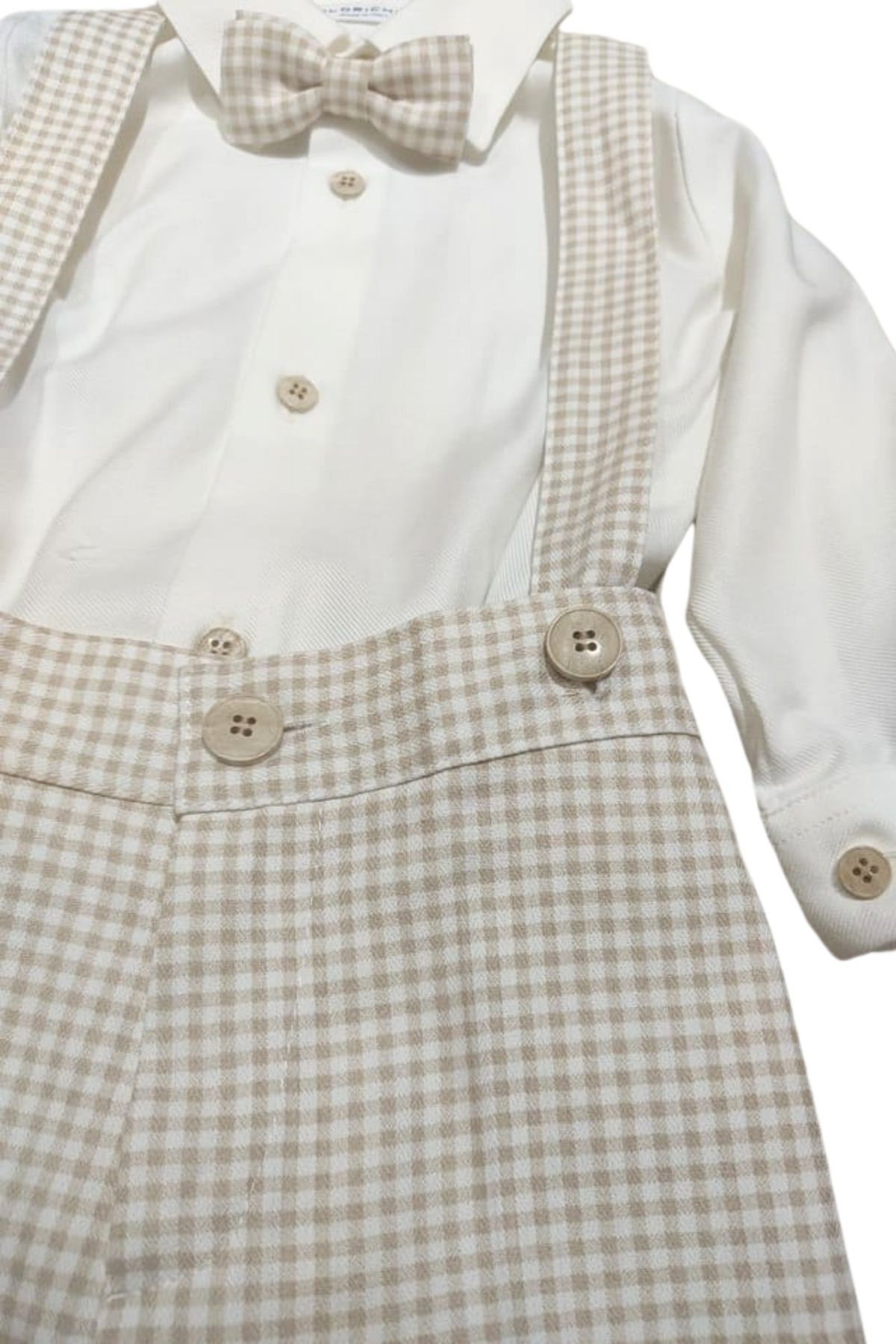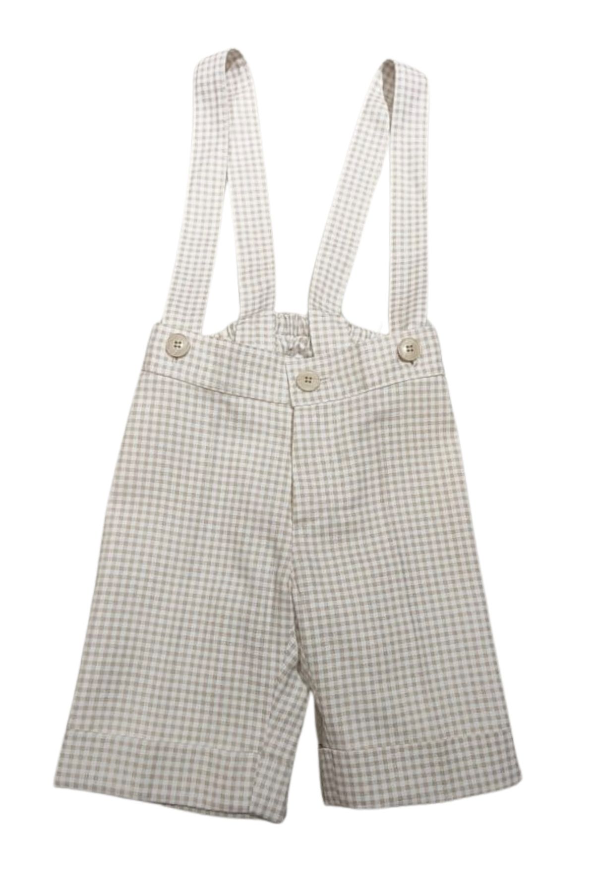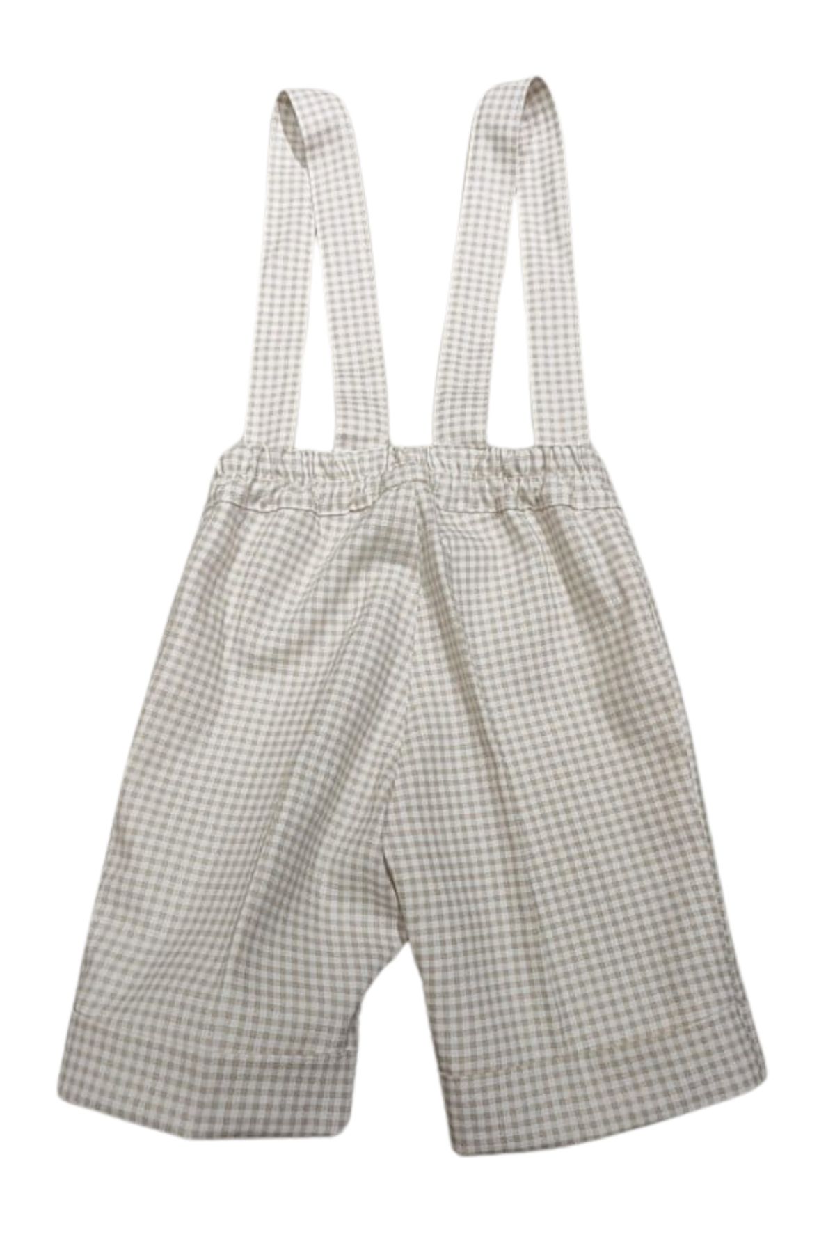 Pantalone stile inglese beige e bianco a quadri, con bretelle da fissare con bottoni, chiusura con bottone zip sul davanti, elastico in vita sul retro