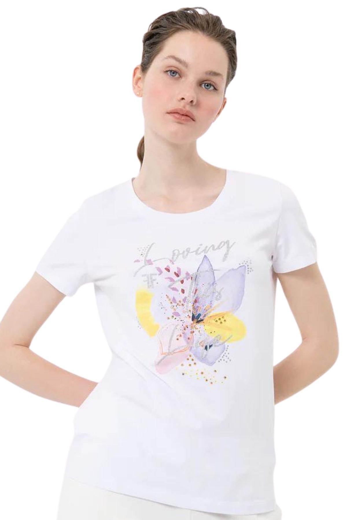 Grafica con fiore e strass luminosi, e con maniche corte
