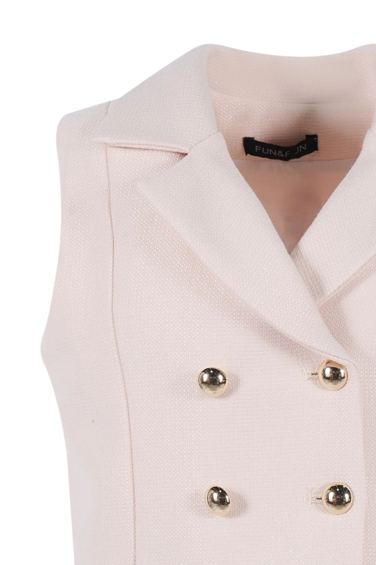 Gilet doppiopetto FUN&FUNModello a scatolettaCon bottoni mezza sfera goldMADE IN ITALY79%POL18%RAY03%SPA