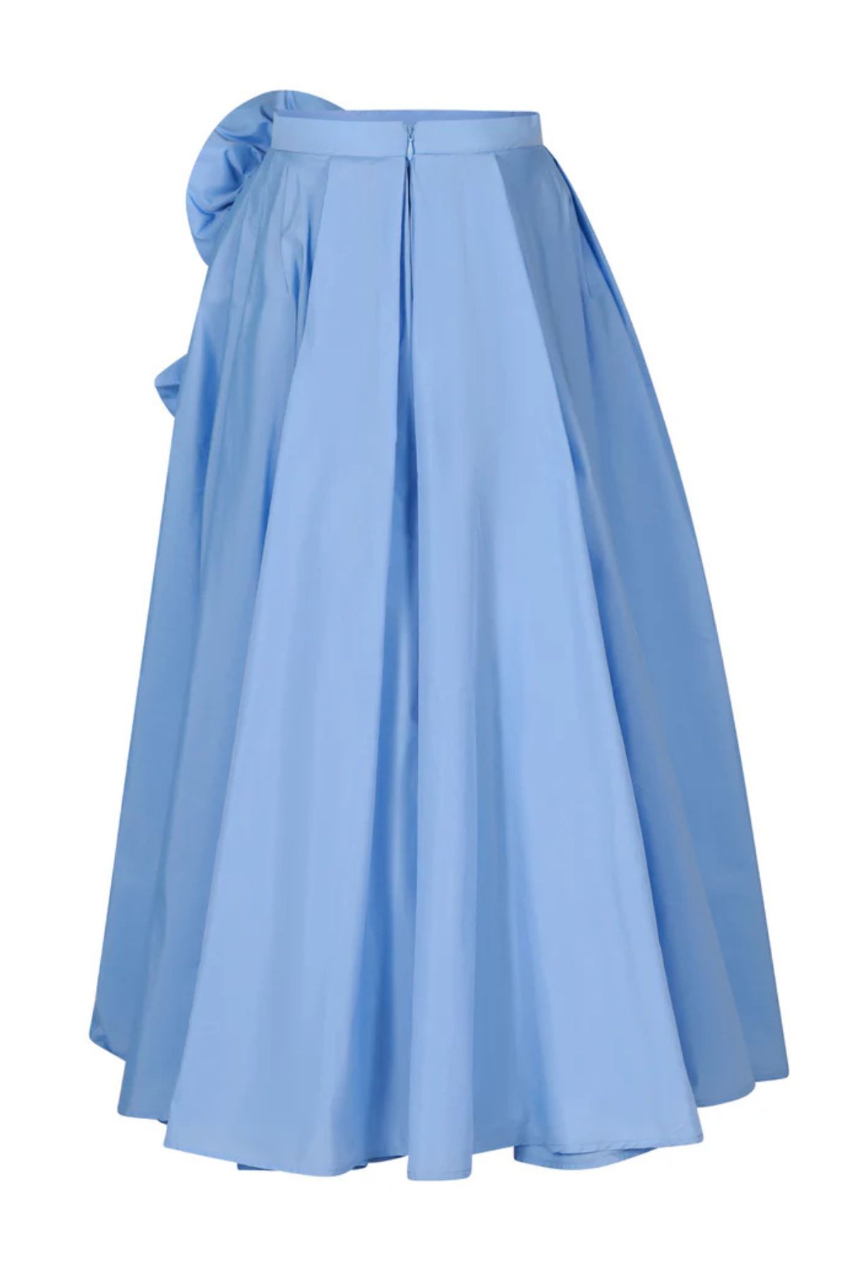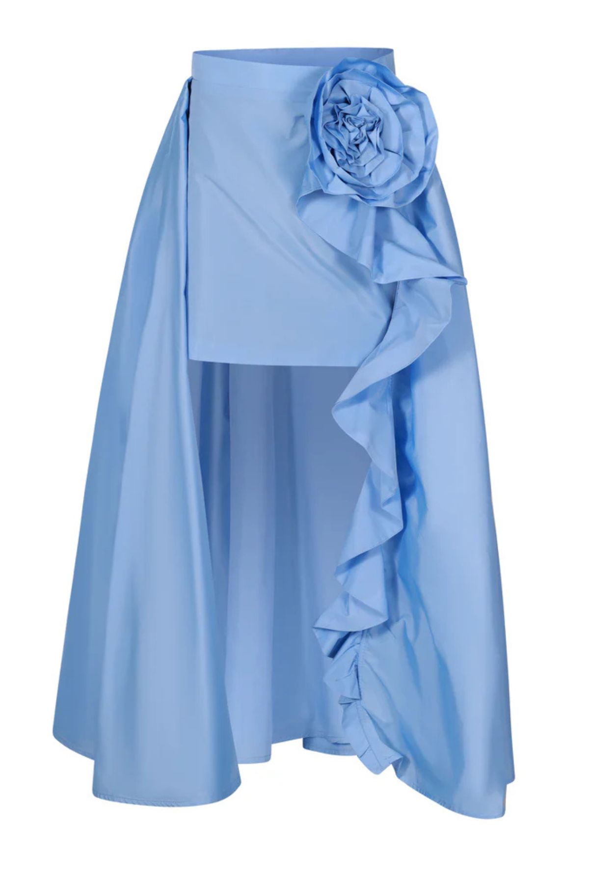 Mini sul davanti, con codè lungo e rouche con fiore, chiusura con zip sul retro