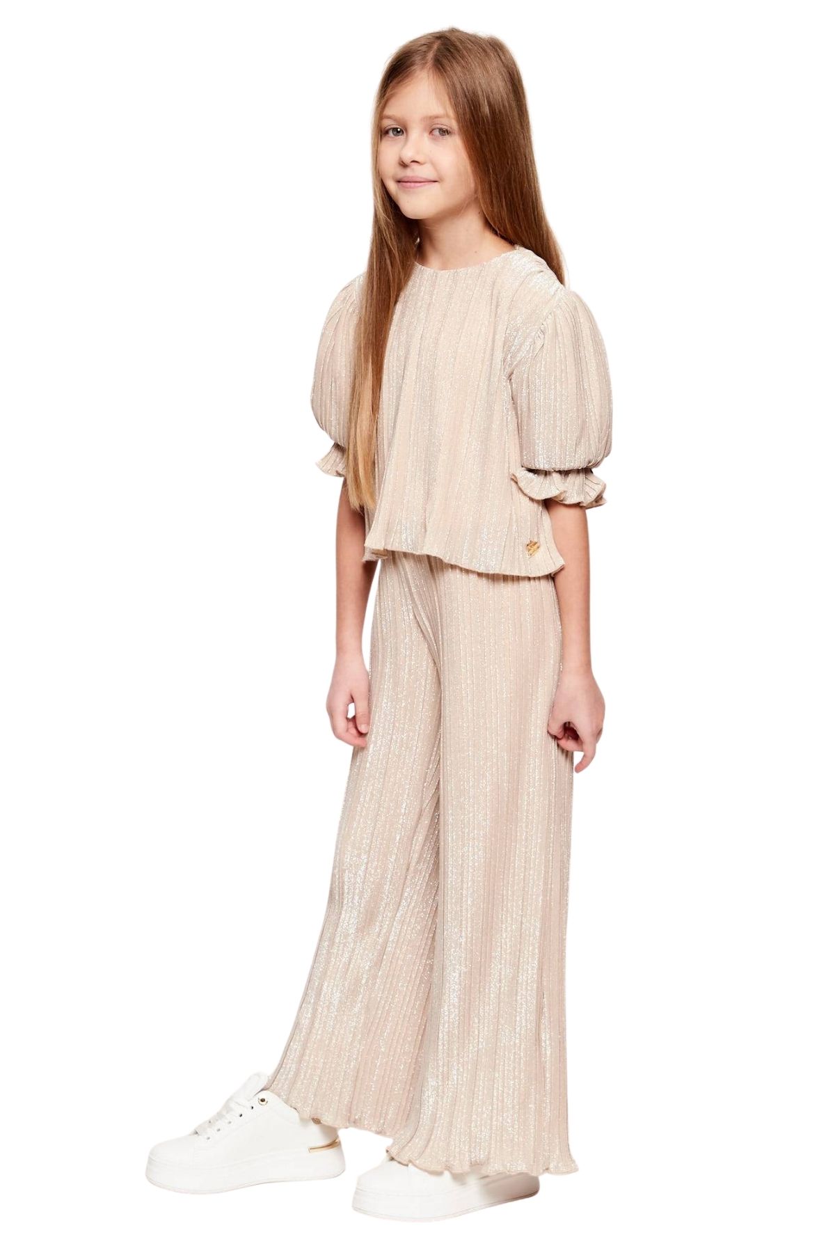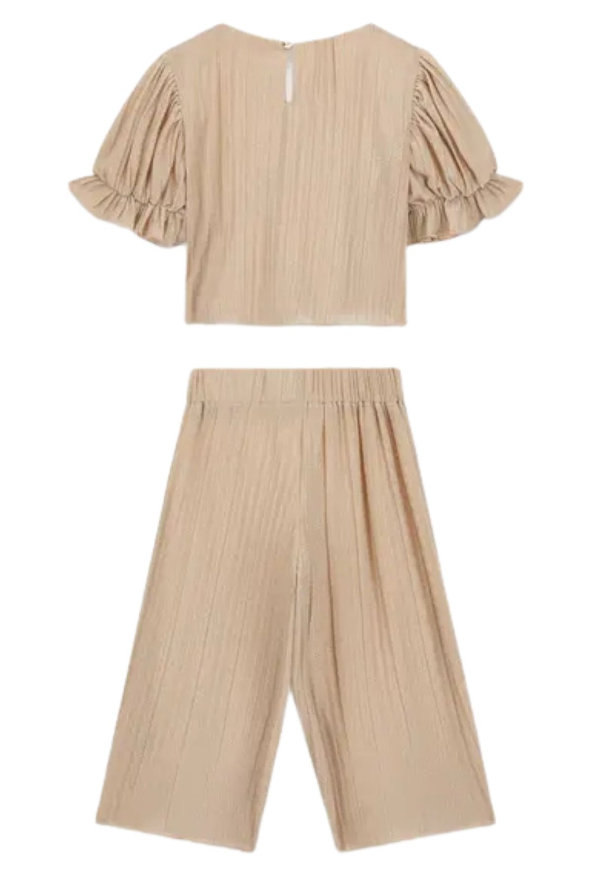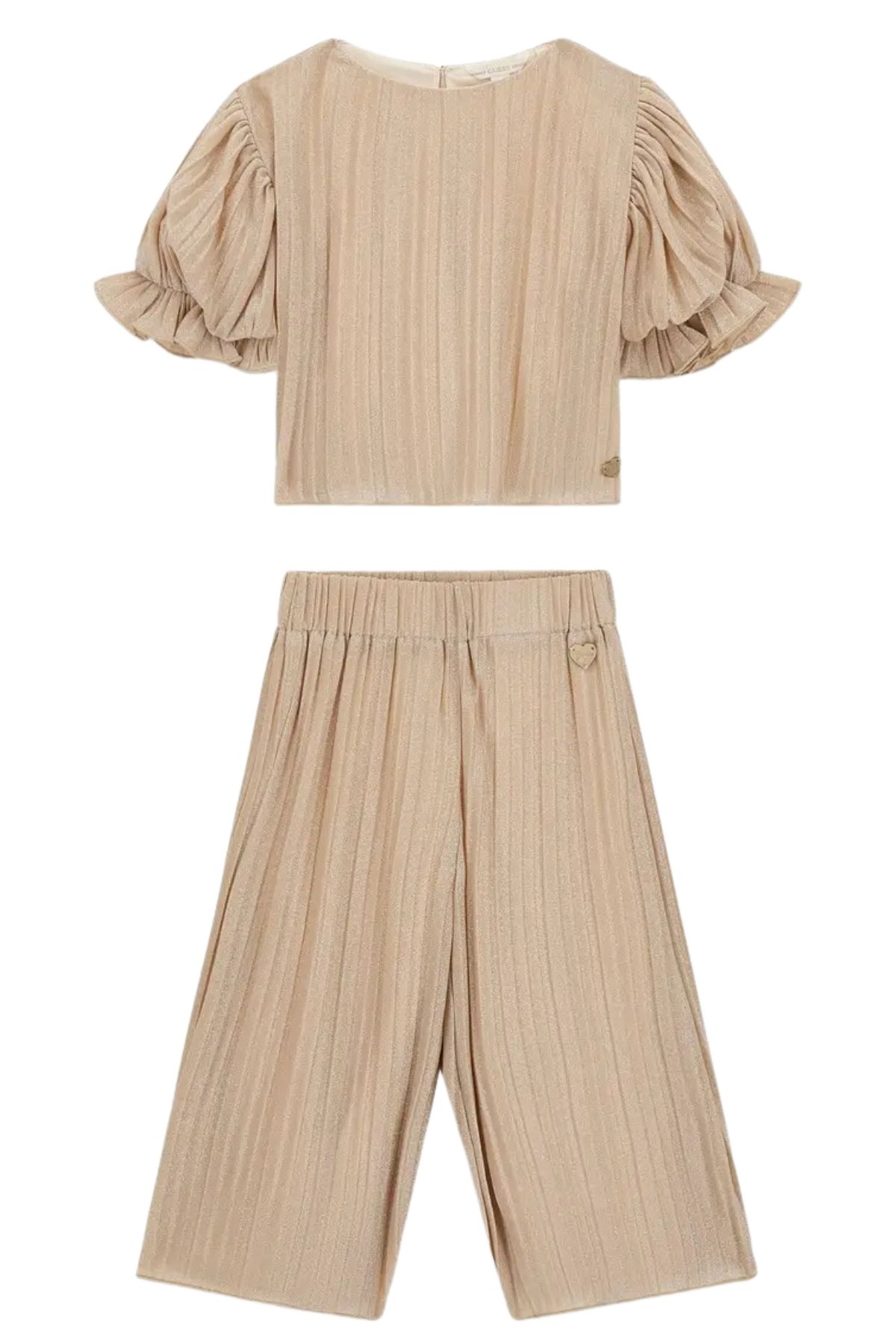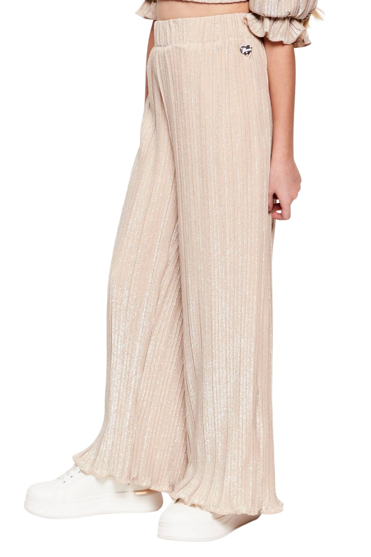 Pantalone modello palazzo con elastico in vita, mini placchetta dorata applicata frontalmente e rifiniture arricciate