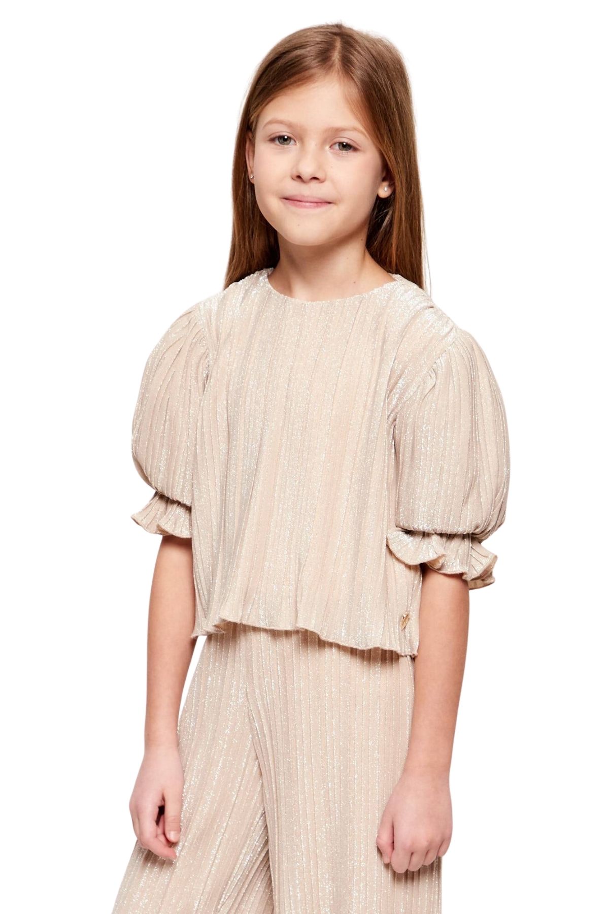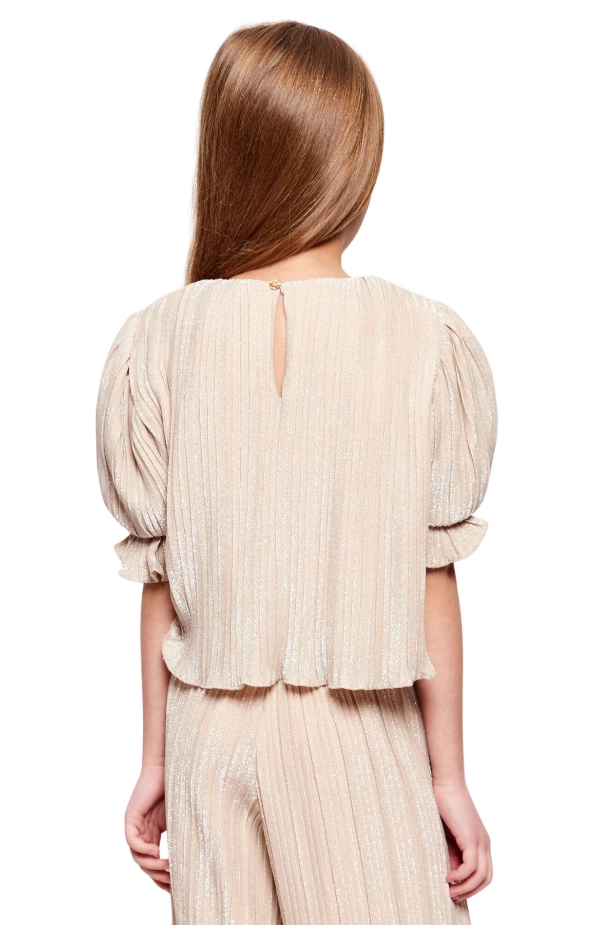 Top girocollo con manica corta a sbuffo, abbottonatura a goccia nel retro collo e orli lattuga