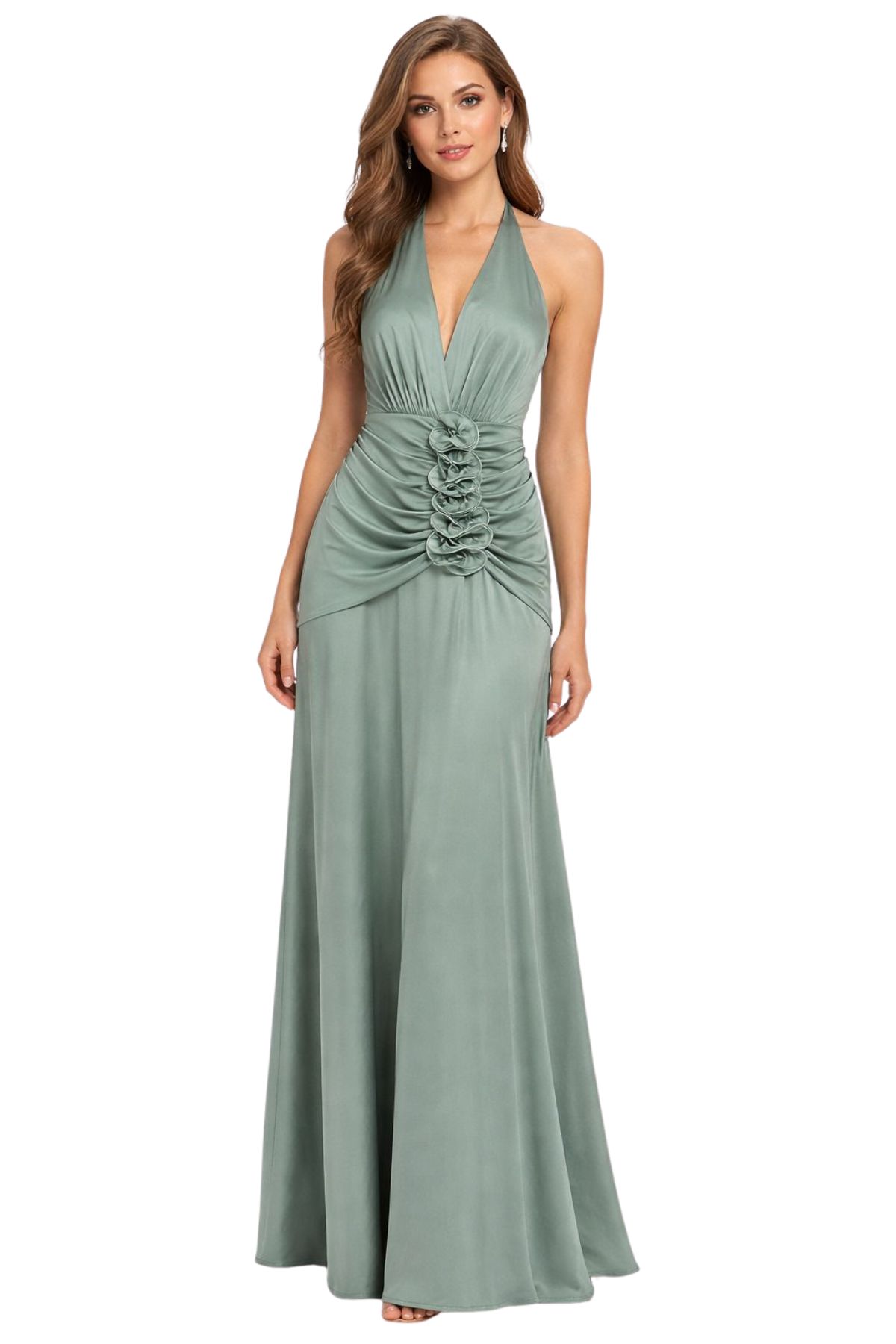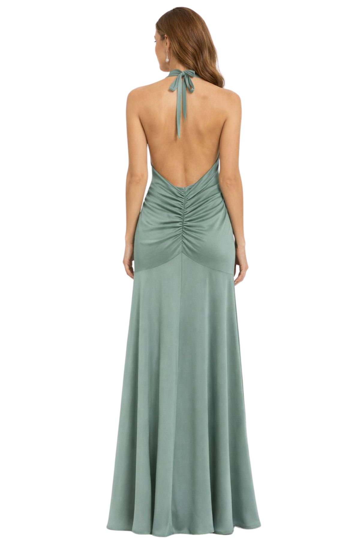 Profondo scollo a V che scende fino alla vita, con un design halter (allacciato dietro il collo) che lascia le spalle e le braccia completamente scoperte