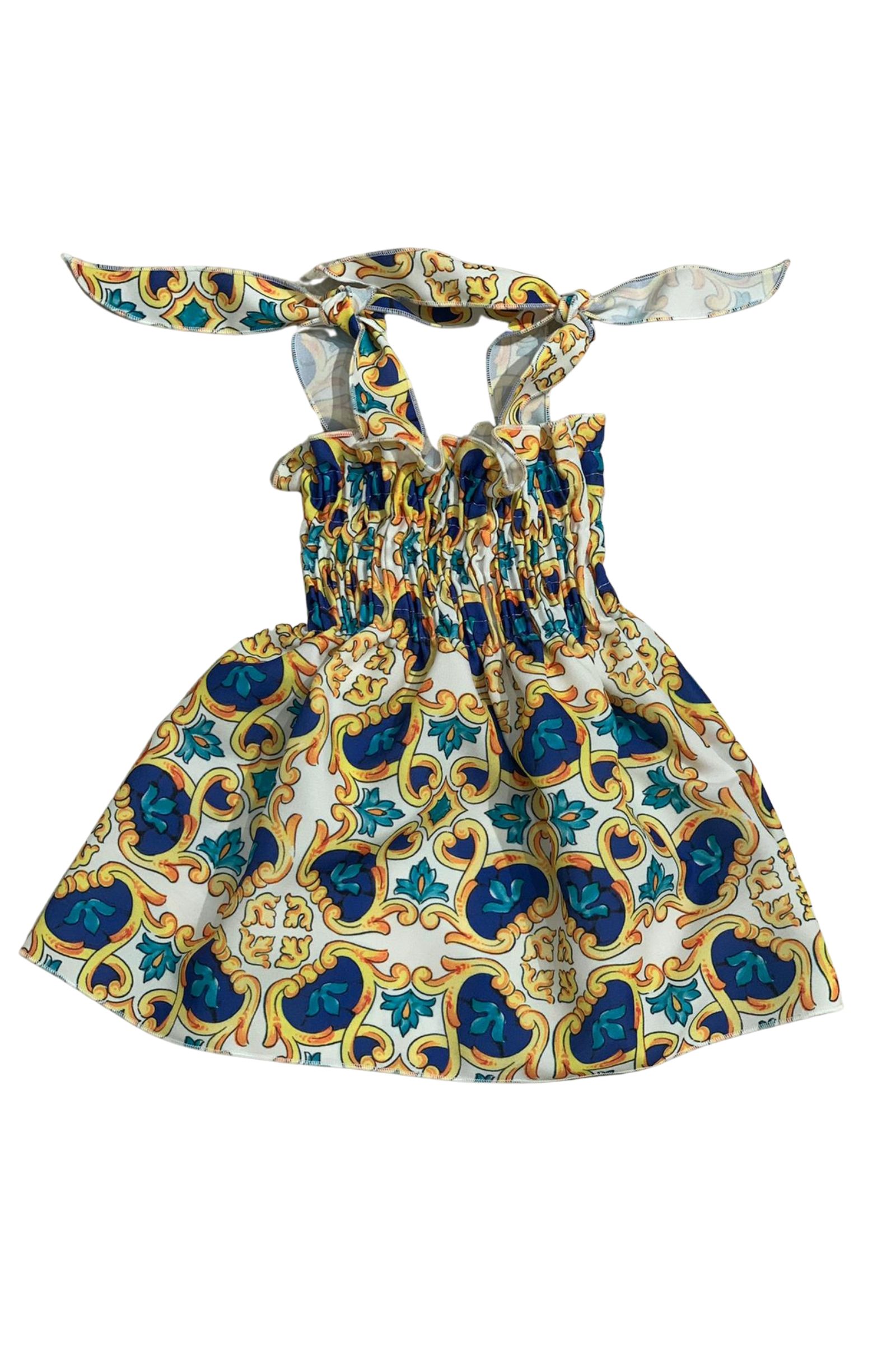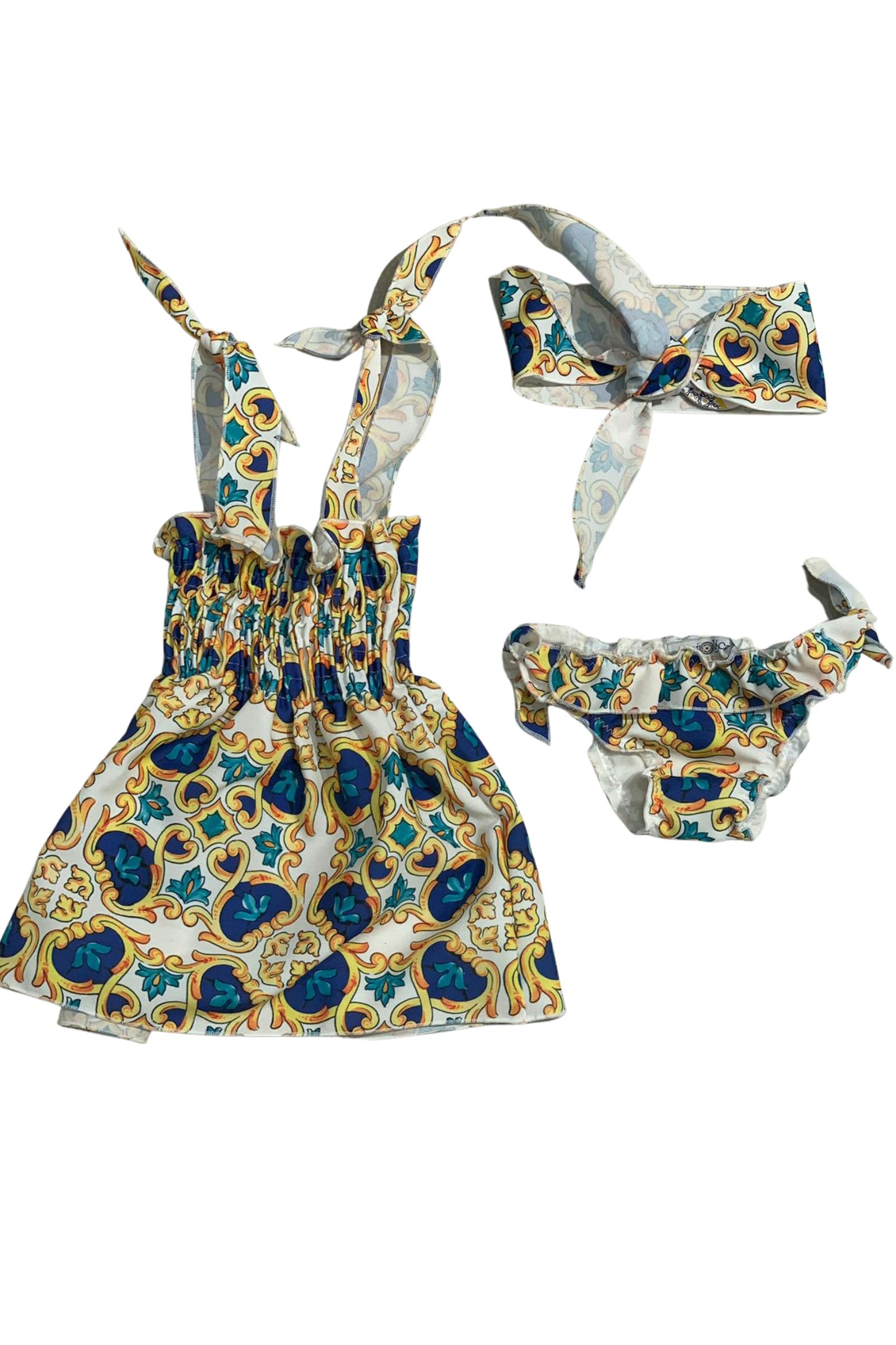 Abitino con corpetto smocklaccetti sulle spalleFantasia maiolicaCompleta il set con il costume e la fascia per capelliCon scatola