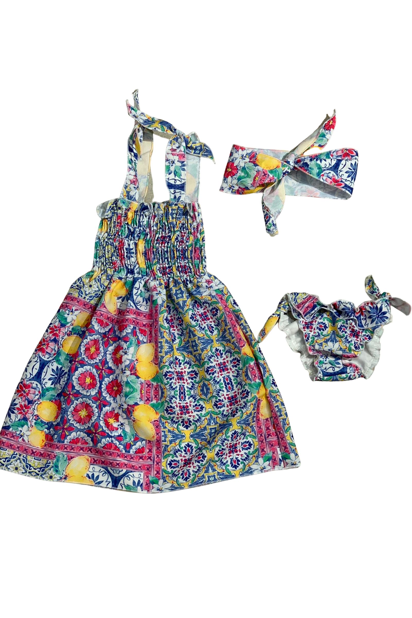 Abitino con corpetto smocklaccetti sulle spalleFantasia maiolicaCompleta il set con il costume e la fascia per capelliCon scatola