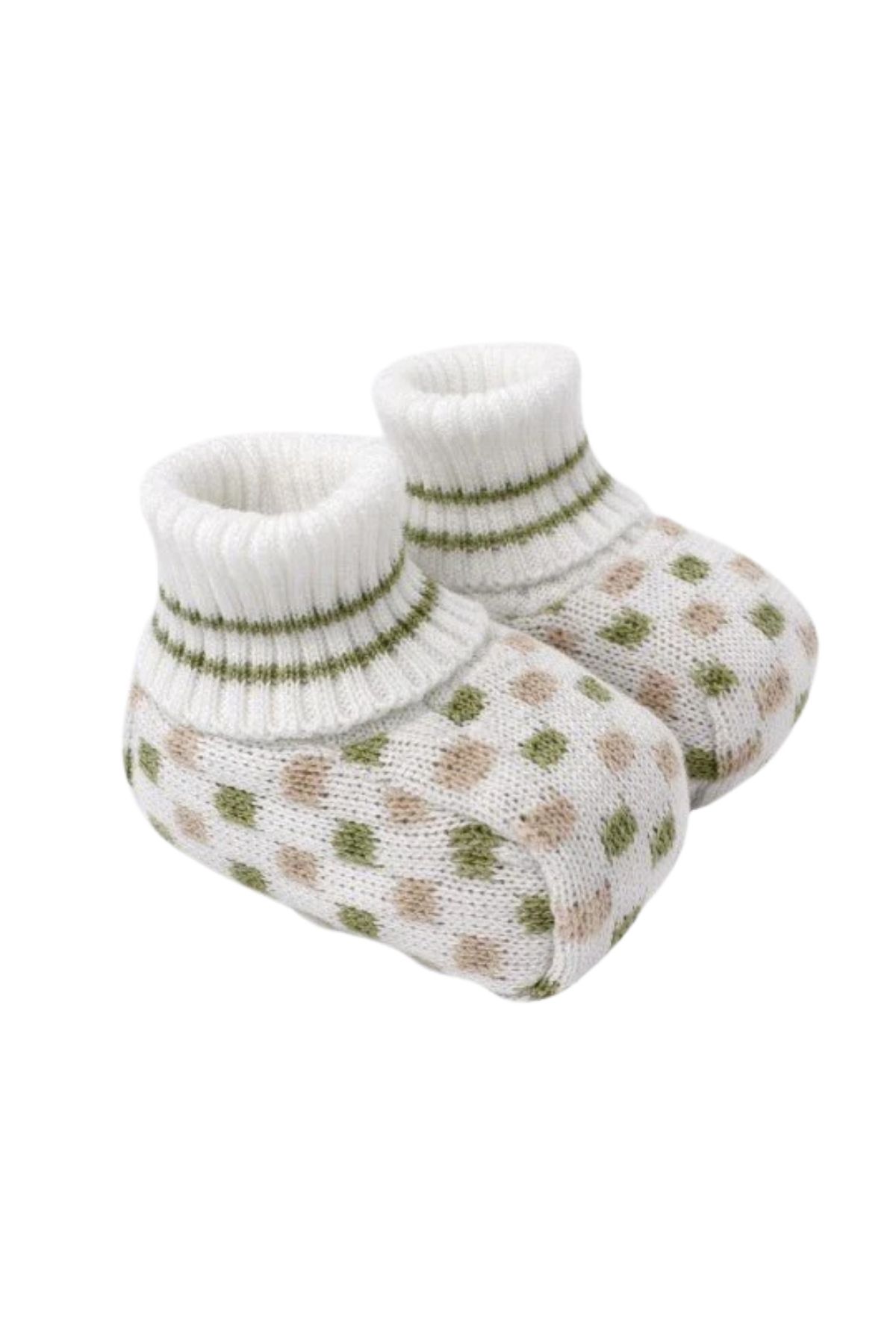 Queste babbucce neonato in puro filo di cotone italiano si distinguono per i raffinati pois bicolore verde oliva e sabbia intrecciati direttamente nella tramatura del filato, su candida base bianca. Il cotone italiano garantisce morbidezza naturale, traspirabilità ottimale e delicatezza sulla pelle sensibile del bebè. Perfette per il corredino nascita, proteggono i piedini durante le ore di riposo e le prime uscite. Il polsino a coste garantisce vestibilità avvolgente che protegge la caviglia con dolcezza, senza comprimere o lasciare segni. I pois bicolore si abbinano perfettamente al coordinato della collezione, completando ogni outfit con eleganza. Ideale per uso quotidiano o come regalo prezioso per la nascita. Le cuciture rinforzate e le finiture accurate riflettono la tradizione artigianale MARLÙ, garantendo resistenza e bellezza che durano nel tempo. Ogni paio di babbucce baby MARLÙ è frutto di attenzione meticolosa ai dettagli e alle finiture impeccabili