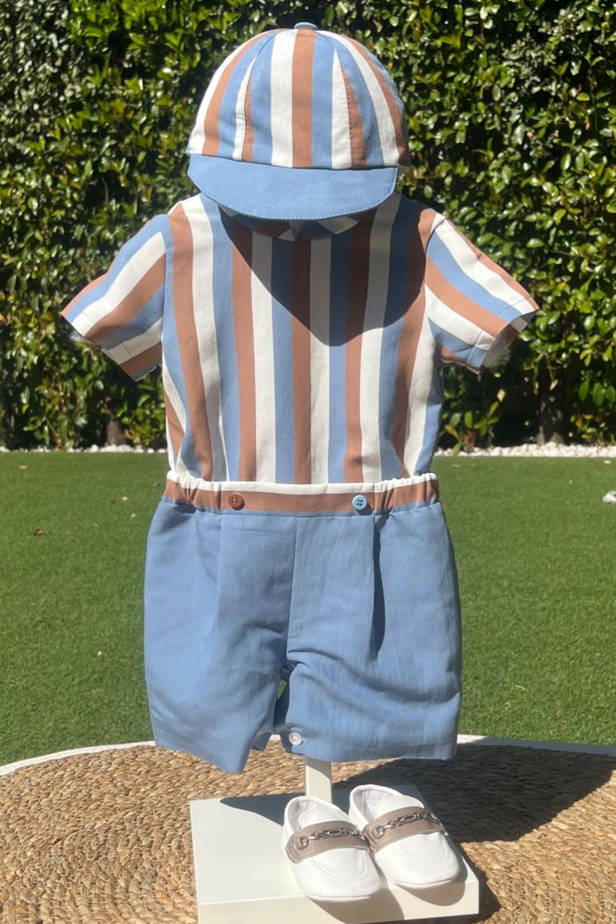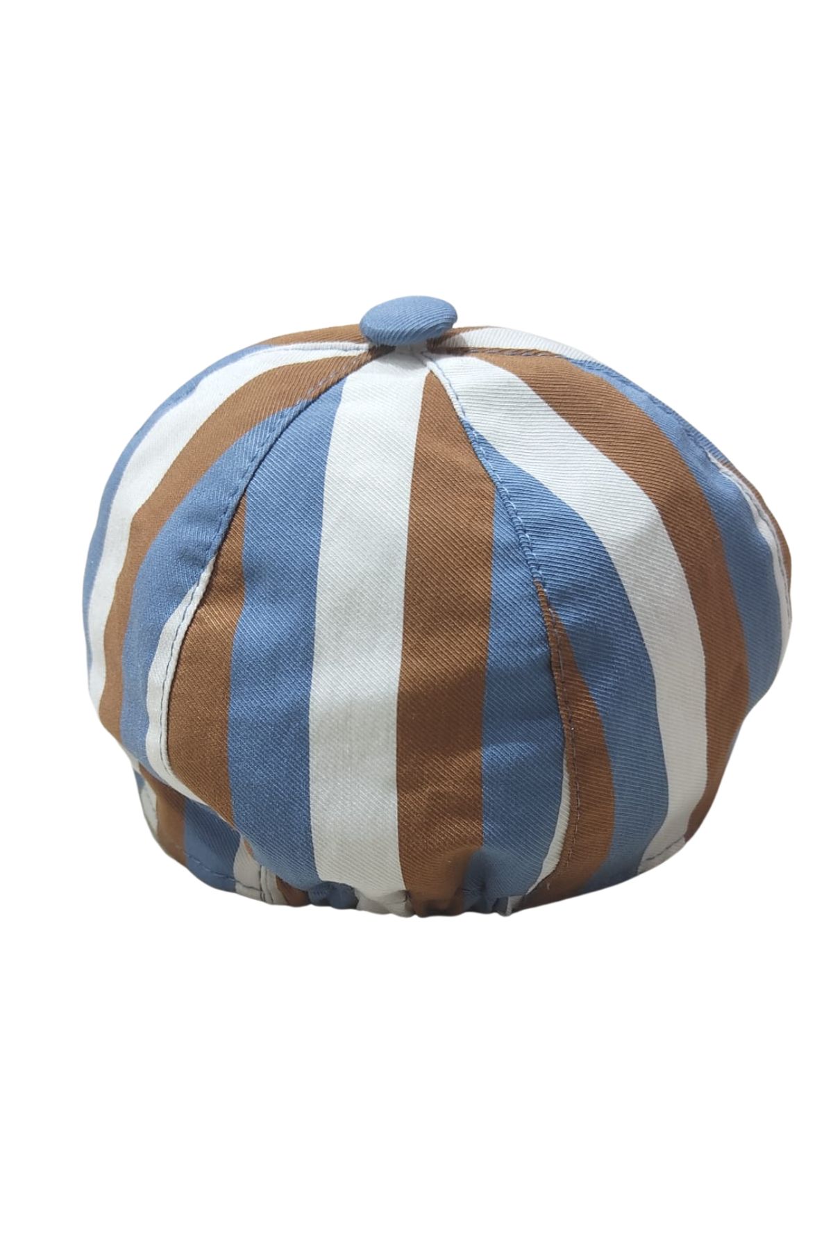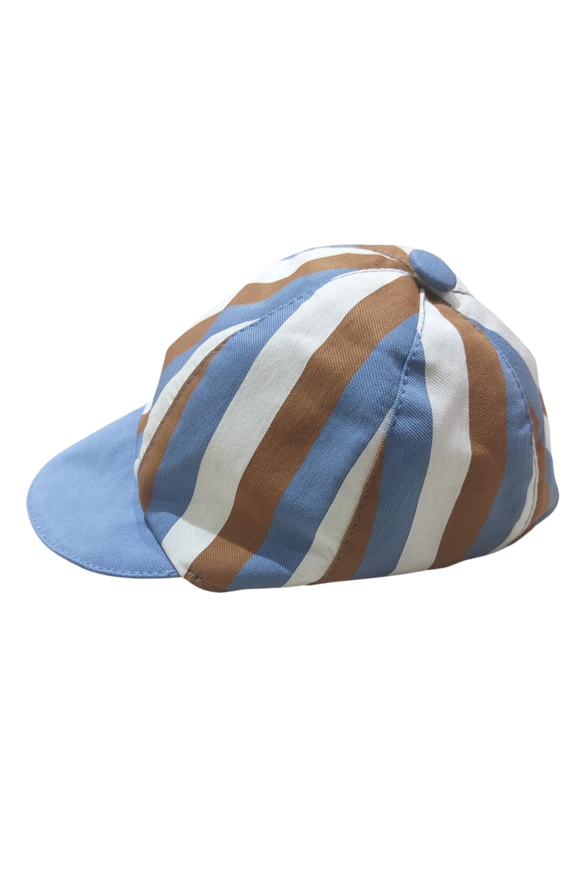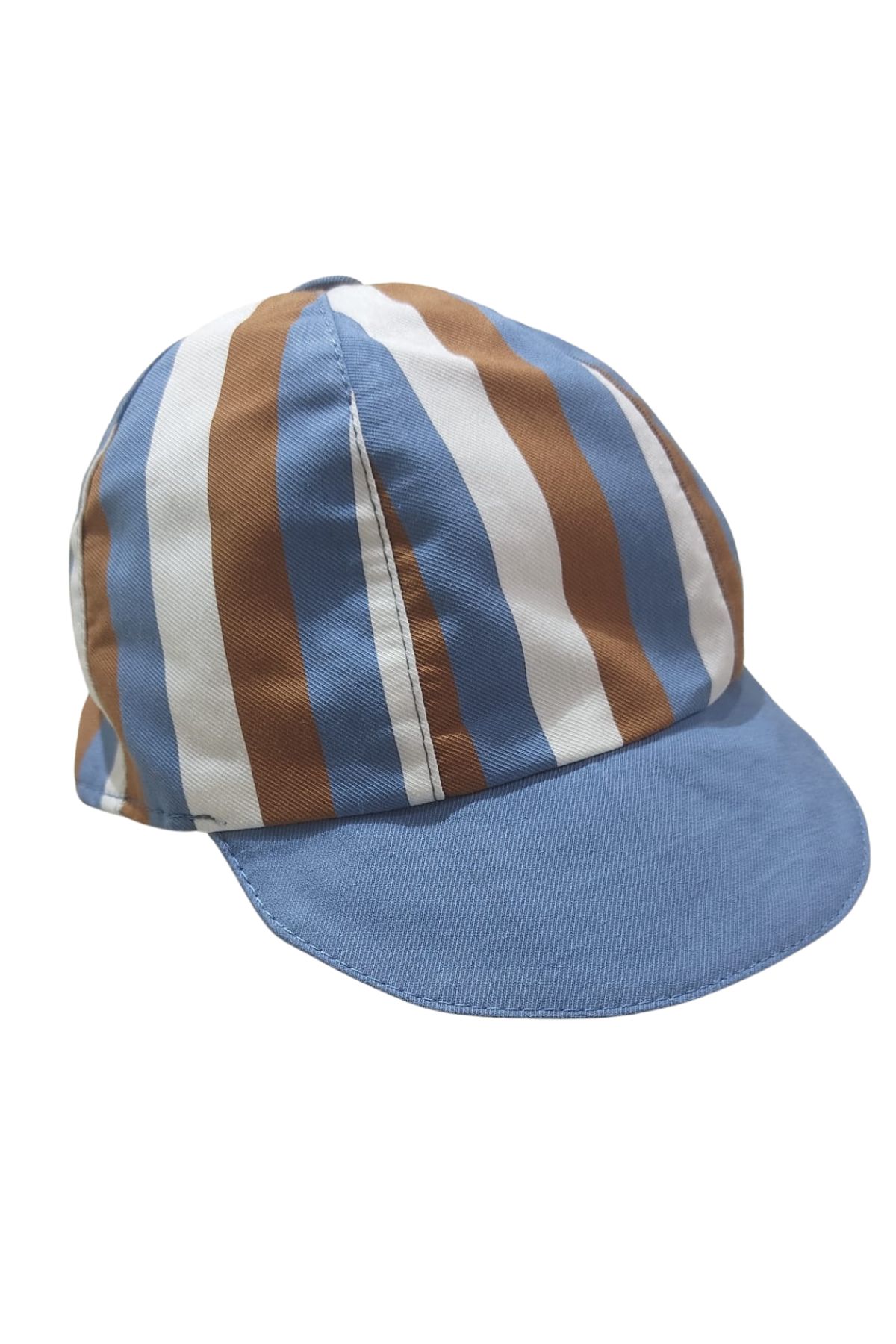 Cappello con visiera azzurra e strisce color azzurro, beige e cammello