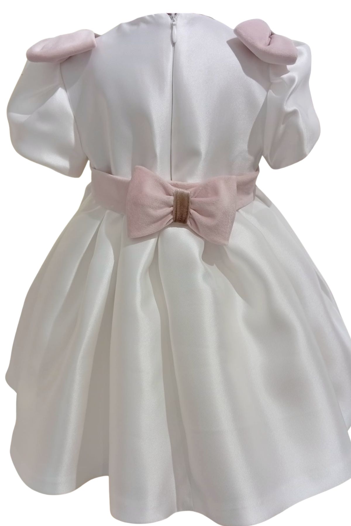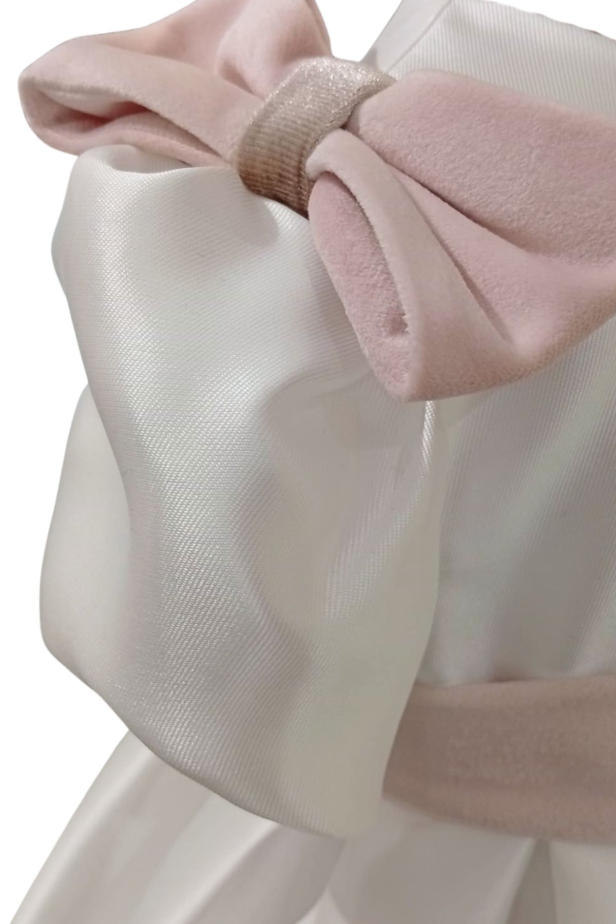 Con fascia in vita rosa pastello e con fiocchi sulle spalle