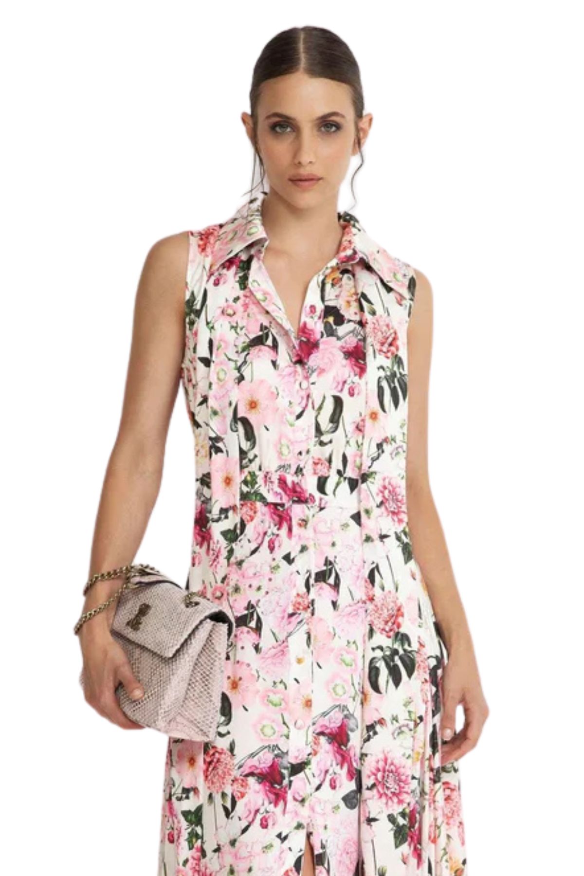 Dal modello smanicato stampato realizzato in viscosa Abbottonatura frontale con fascia da legare sul collo o in vita